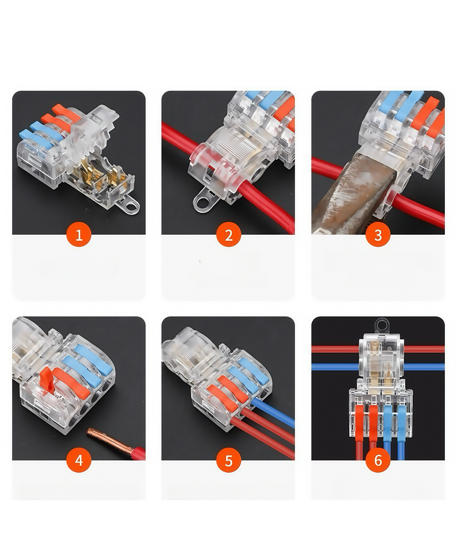 De har et praktisk tilkoblingssystem, med oransje vippearm, som gjør det enkelt å få de myke lederne inn i hullene.
