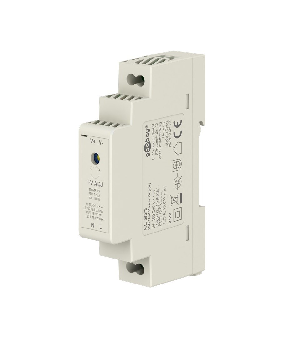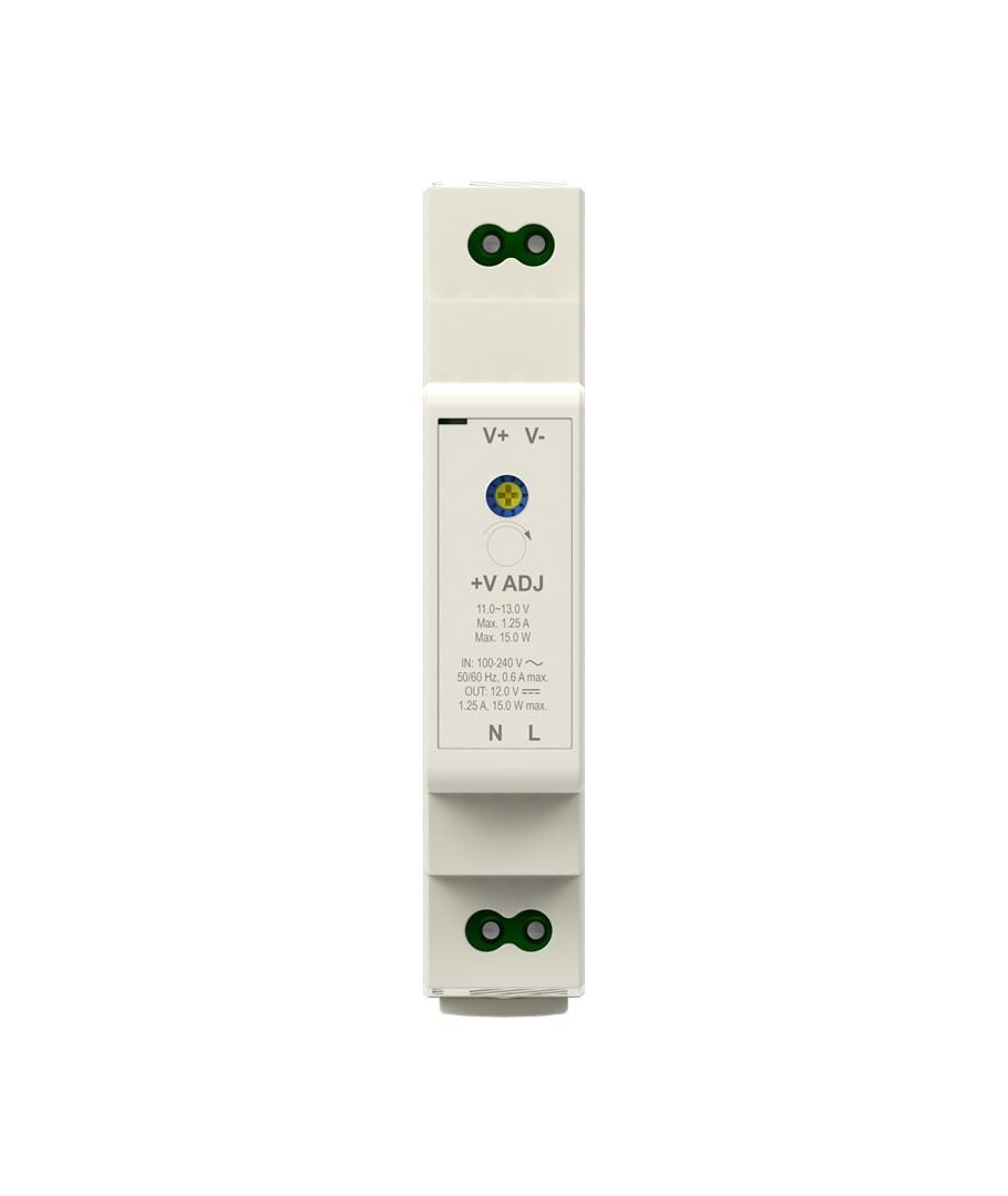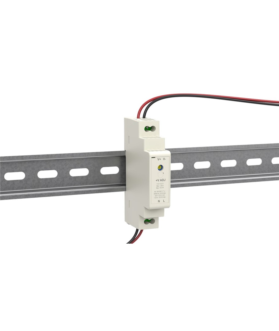 12V DC 1,25A strømforsyning for DIN skinne montering.