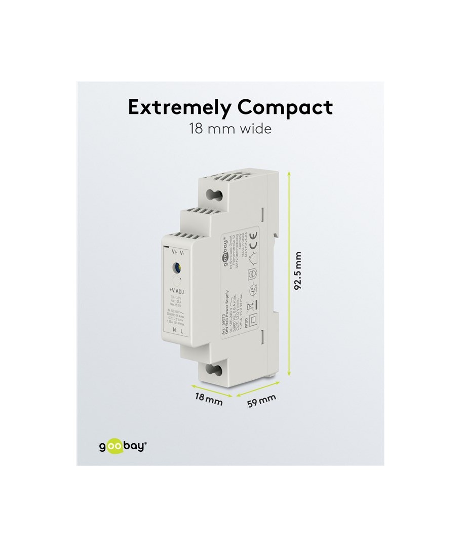 Denne DIN skinne strømforsyningen kommer i en kompakt størrelse, og med mål på 18 x 92,5 x 59 mm, er den enkel å installere i eksisterende skap eller monteringssystemer. Dimensjonene gjør den svært plassbesparende uten at det går på bekostning av ytelse.