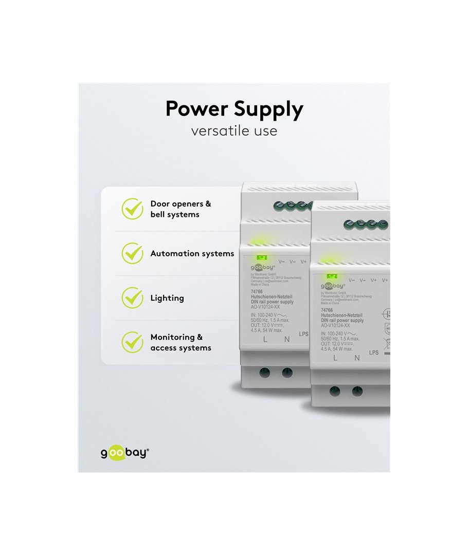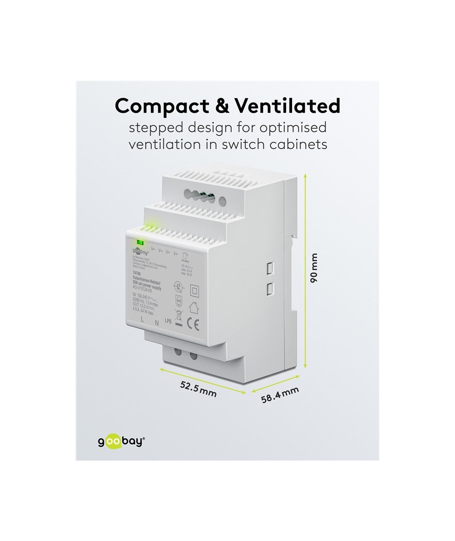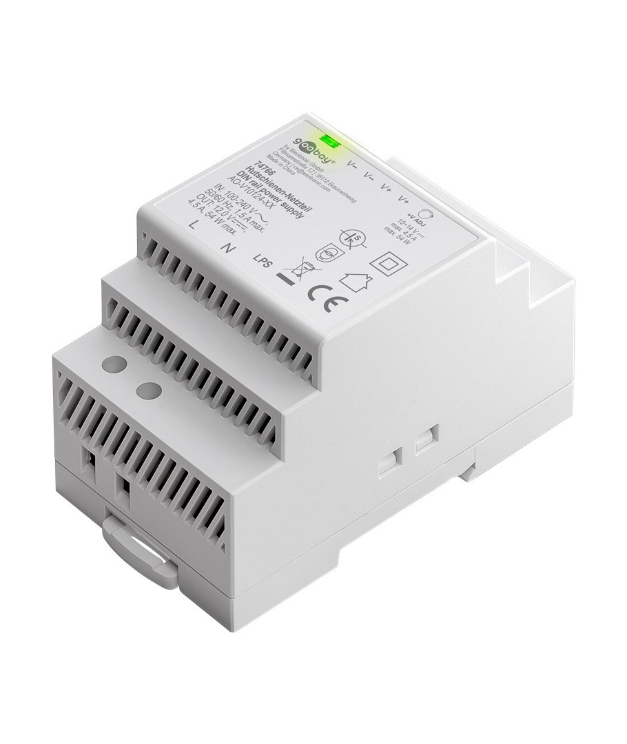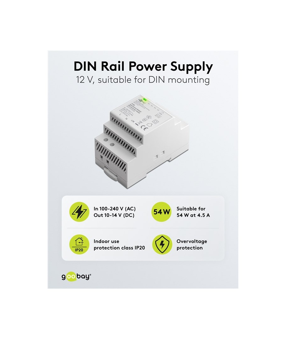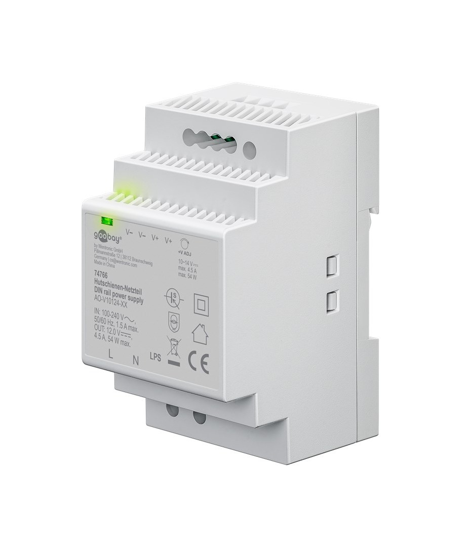 12V DC 4,5A strømforsyning for DIN skinne montering.