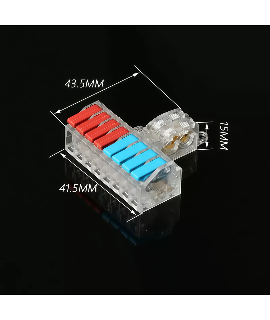 De har et praktisk tilkoblingssystem, med oransje/blå vippearm, som gjør det enkelt å få de fleksible lederne inn i hullene.
