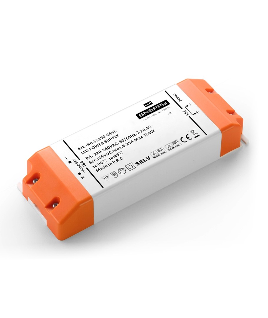 Kvalitets LED-driver fra Snappy på 1-150W som leverer en konstant spenning på 24V DC. Kan ikke anbefales til LED-pærer.