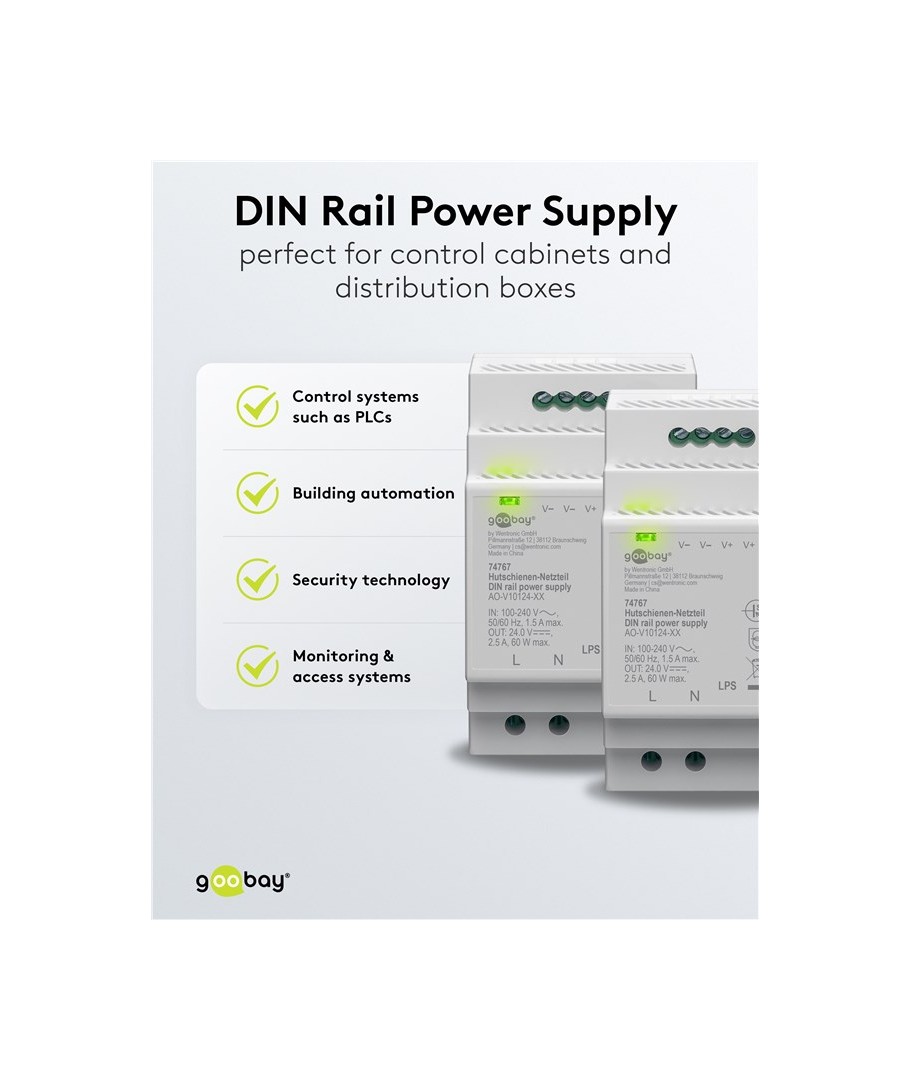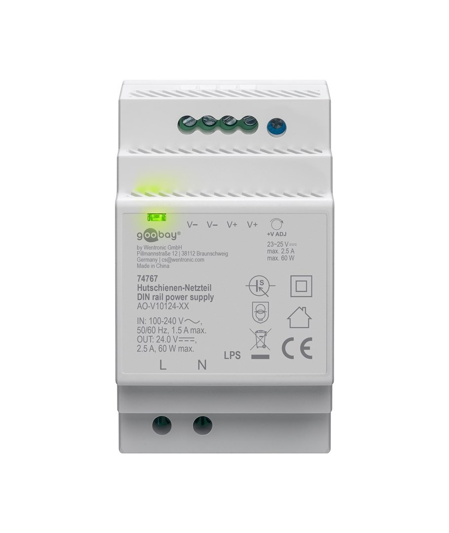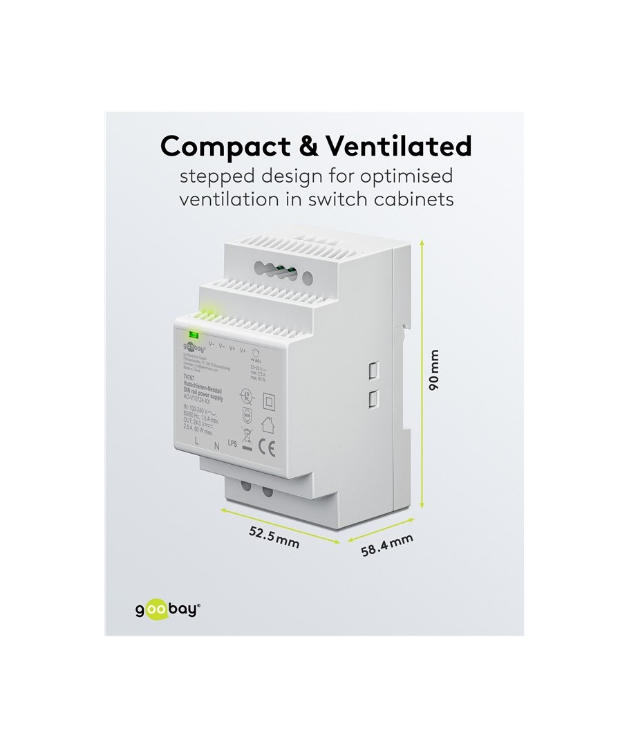 24V DC 2,5A strømforsyning for DIN skinne montering.