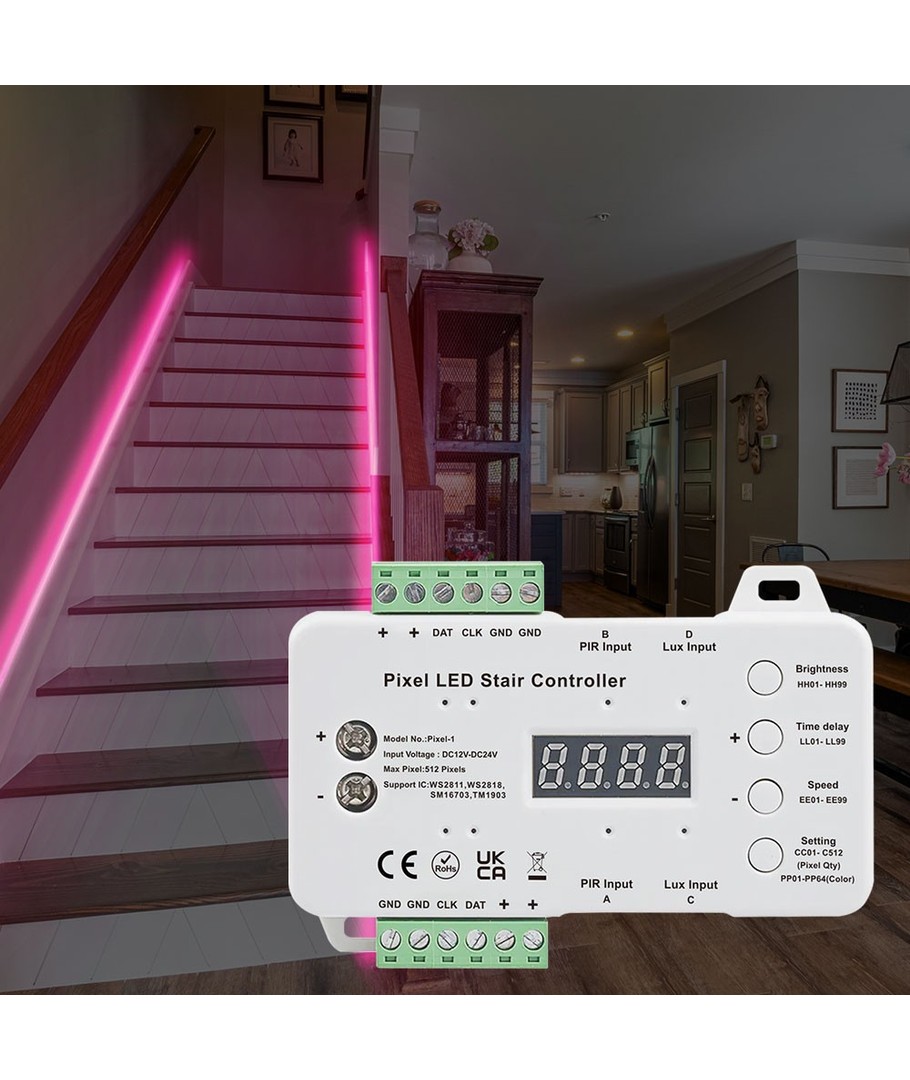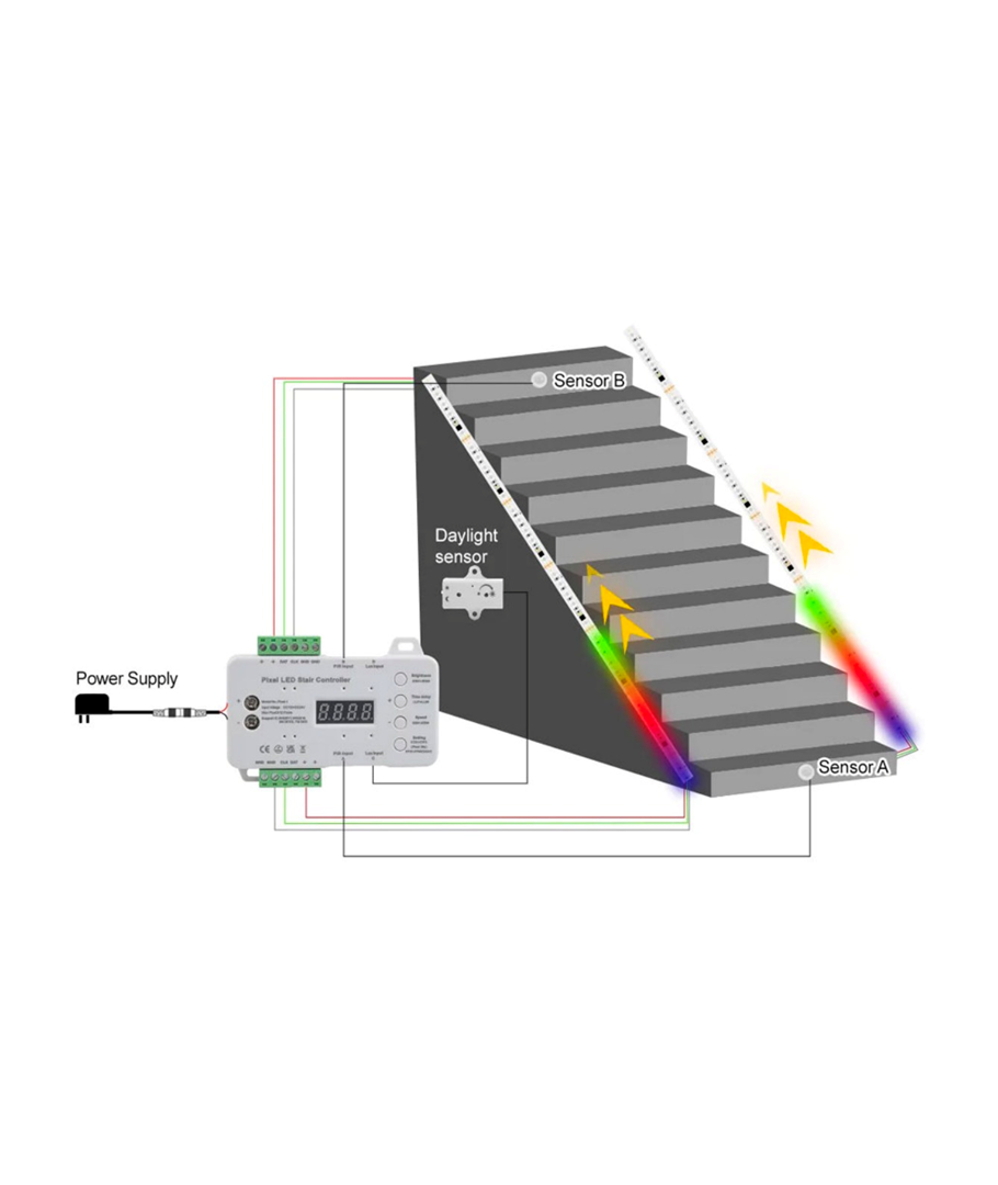 Dette intelligente kontrollsenteret gir deg full kontroll over trappebelysningen. Tilpass lysmønstre og lysstyrke enkelt med den medfølgende sensoren.