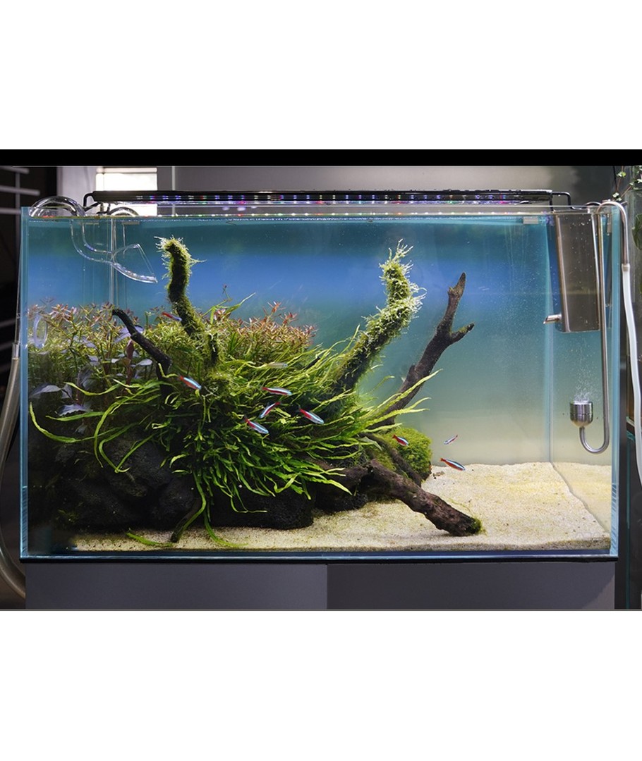 Denne armaturen er utstyrt med hvit, blå, rød og grønn LED-belysning og har en høy lysspredning på 120 grader for å oppnå en jevn fordeling av lys, ideell for å fremheve fargene på plantene og fiskene i akvariet.