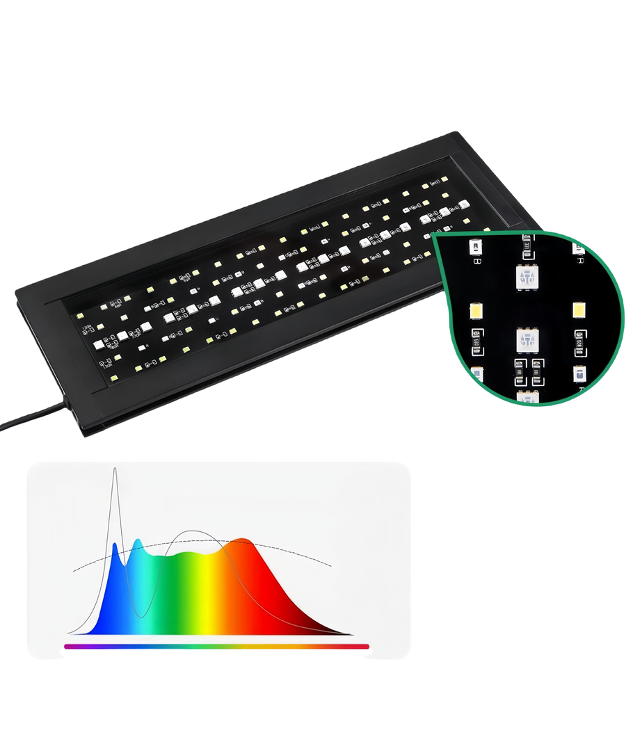 Den integrerte RGBW-teknologien tilbyr en bred palett av fargetoner, noe som gir deg muligheten til å skape den rette atmosfæren i akvariet ditt. Utnytt timerfunksjonen for å skapa naturlige lysintervaller som etterligner solens syklus, og gi plantene og dyrene en mer naturtro opplevelse.