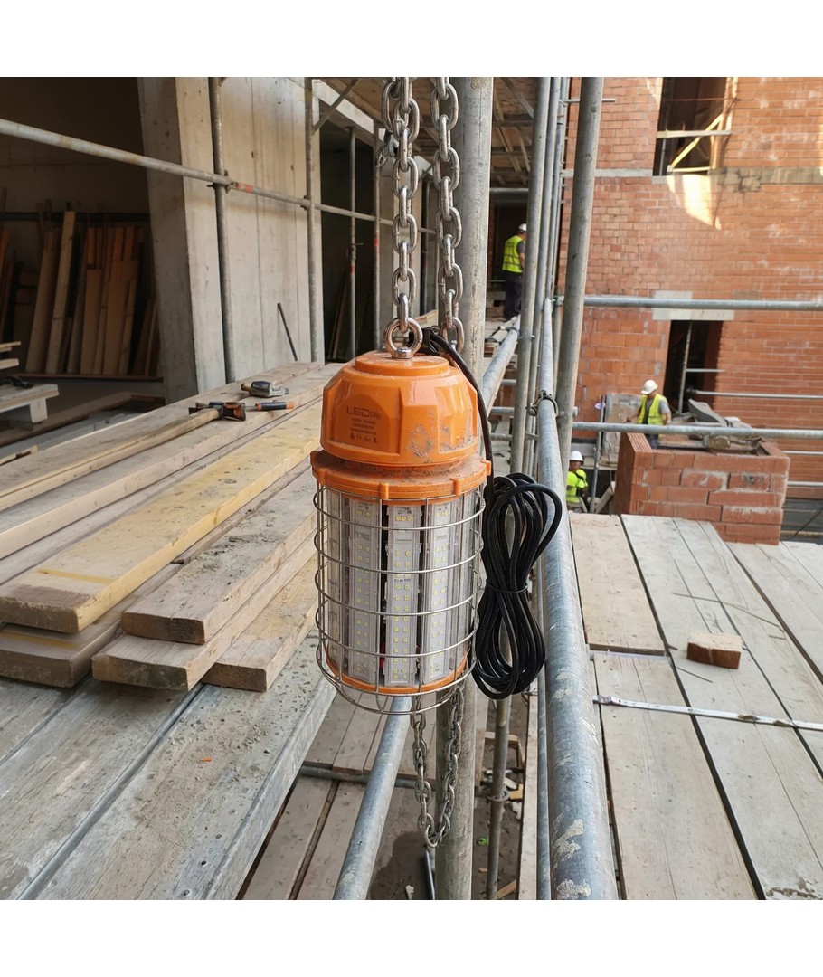 En sterk og praktisk arbeidslampe som gir pålitelig belysning til både byggeplasser, verksteder og renoveringsoppgaver.
