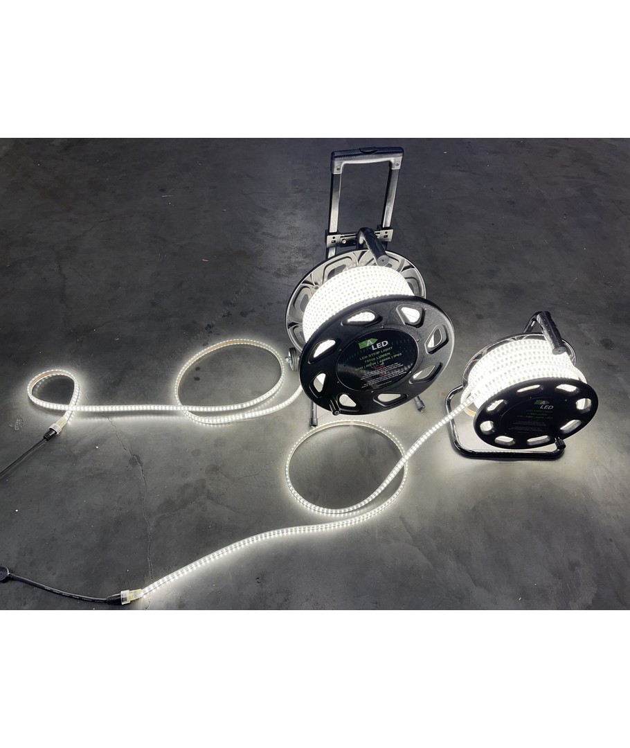 Stripen leveres med trommel og 25 meter LED strip, i tillegg medfølger også en gummikabel med godkjent EU stikkontakt.