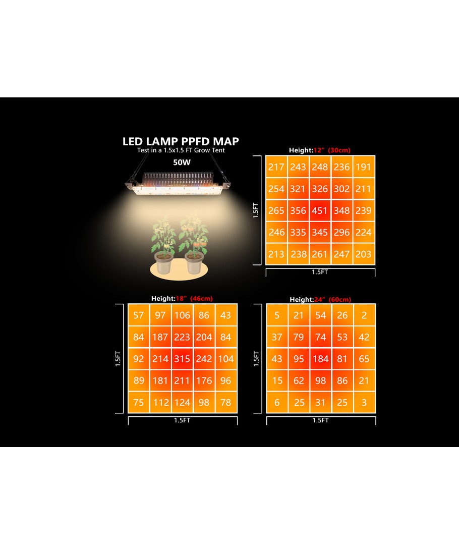 | PAR (senterverdi): | 451 ppfd 30cm 315 ppfd 46cm 184 60 cm |