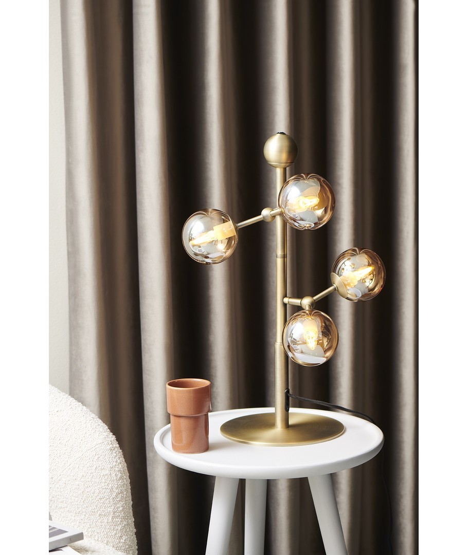 Lampen kommer i en iøynefallende design med fire glasskuler i amber glass, som skaper en innbydende og varm atmosfære. Den antikke messingfargen gir lampen en klassisk følelse, og fungerer som et dekorativt element som passer inn i mange interiørstiler. Perfekt for både hjem og kontor.