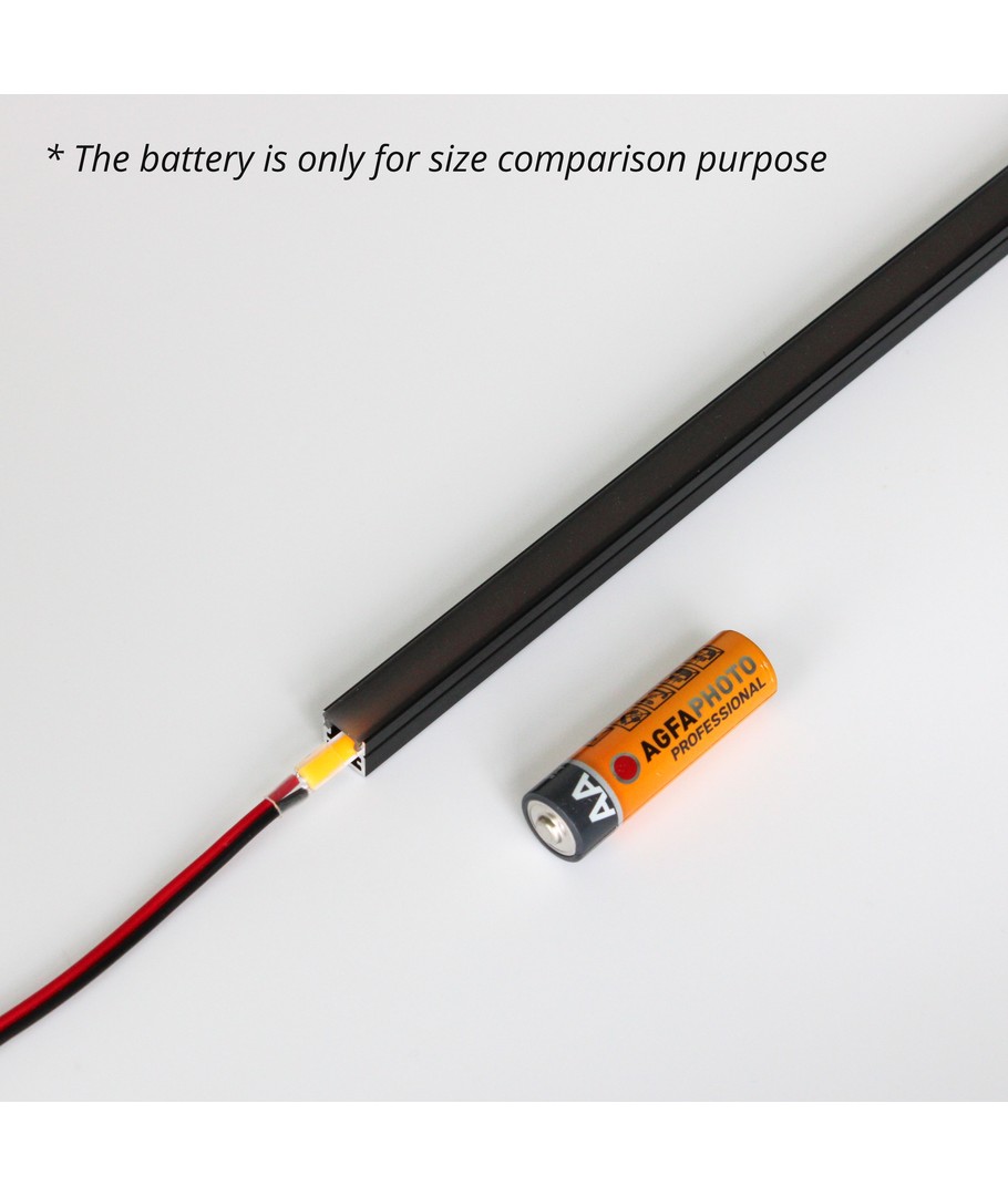 Den sorte aluminiumsprofilen monteres enkelt mellom lamellene på akustikkpanelene, noe som skaper et jevnt og stilig utseende. Den 2 meter lange kabelen gjør det enkelt å koble stripperen til en 24V strømforsyning. Velg en passende strømforsyning basert på antall meter LED-stripe du trenger. Husk å også vurdere en dimmer for justerbar lysstyrke.