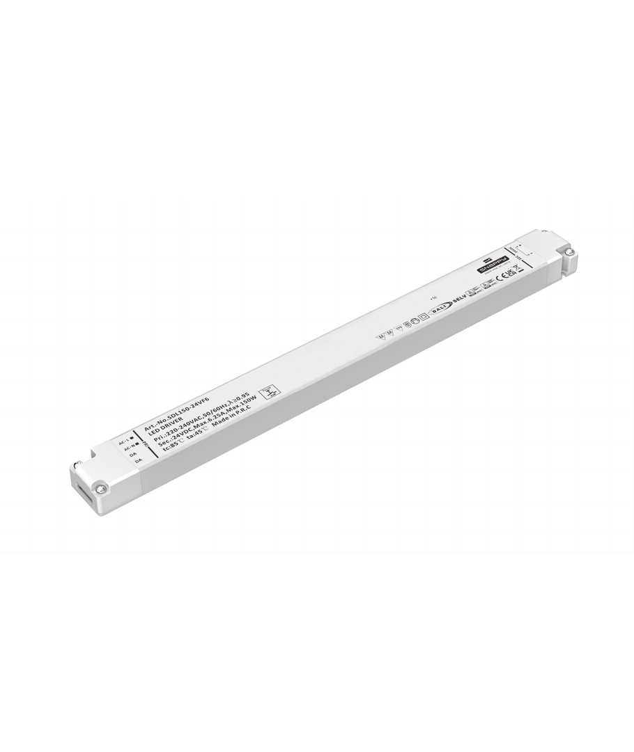Dimmbar kvalitets LED driver fra Snappy (Slim-utgave) på 1-150W som leverer en konstant spenning på 24V DC - Driveren er perfekt for dimming av 24V LED strips, skinner og 24V LED-pærer som er dimbare.