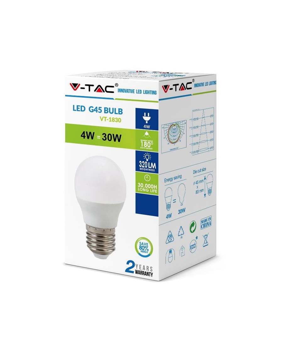 Med sin kompakte størrelse og høye lysspredning er denne 4W LED-pæren med E27 stor fatning den perfekte erstatningen for en 30W tradisjonell pære. Den kobles enkelt til en 230V forsyning, og gir en lysstyrke på 320 lumen, noe som sikrer en jevn fordeling av lyset med en bred lysspredning på 180 grader.