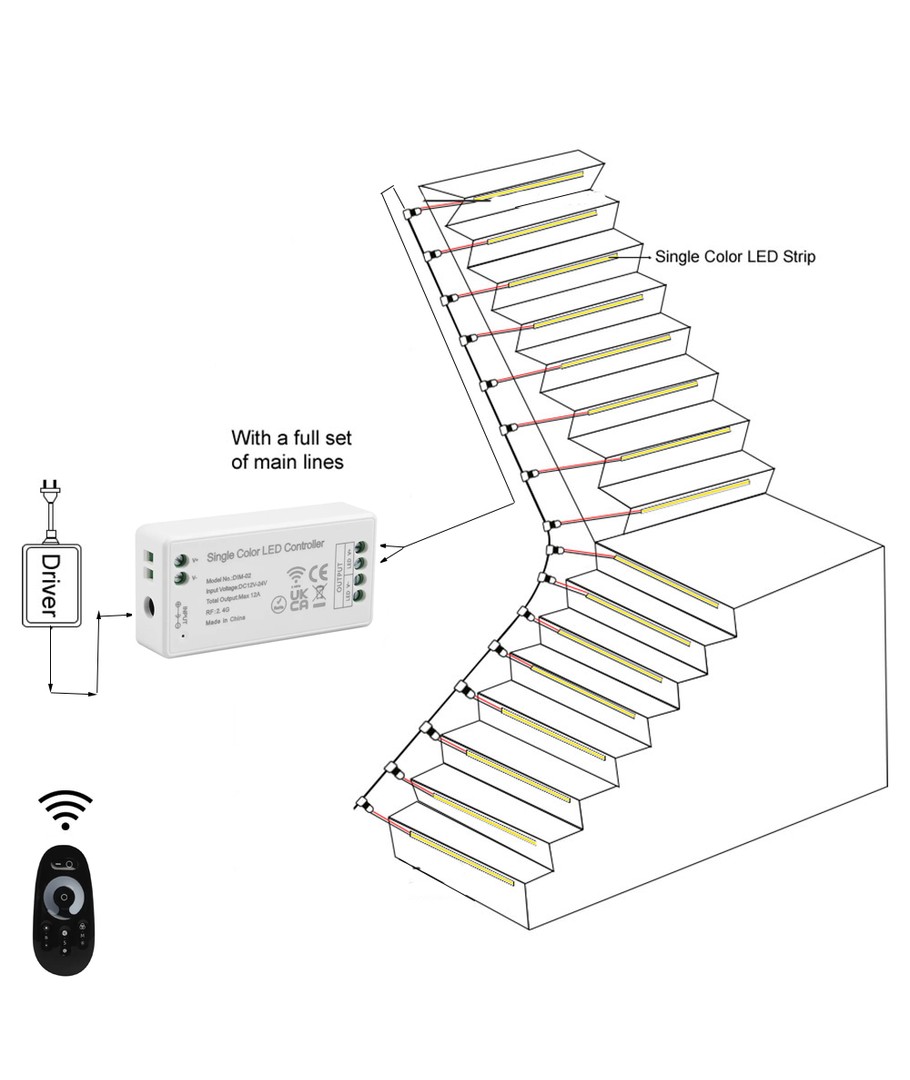 Enkel montering, der det trekkes en "master" ledning på den ene siden av trappen, der lyset til hvert trinn enkelt kobles til.