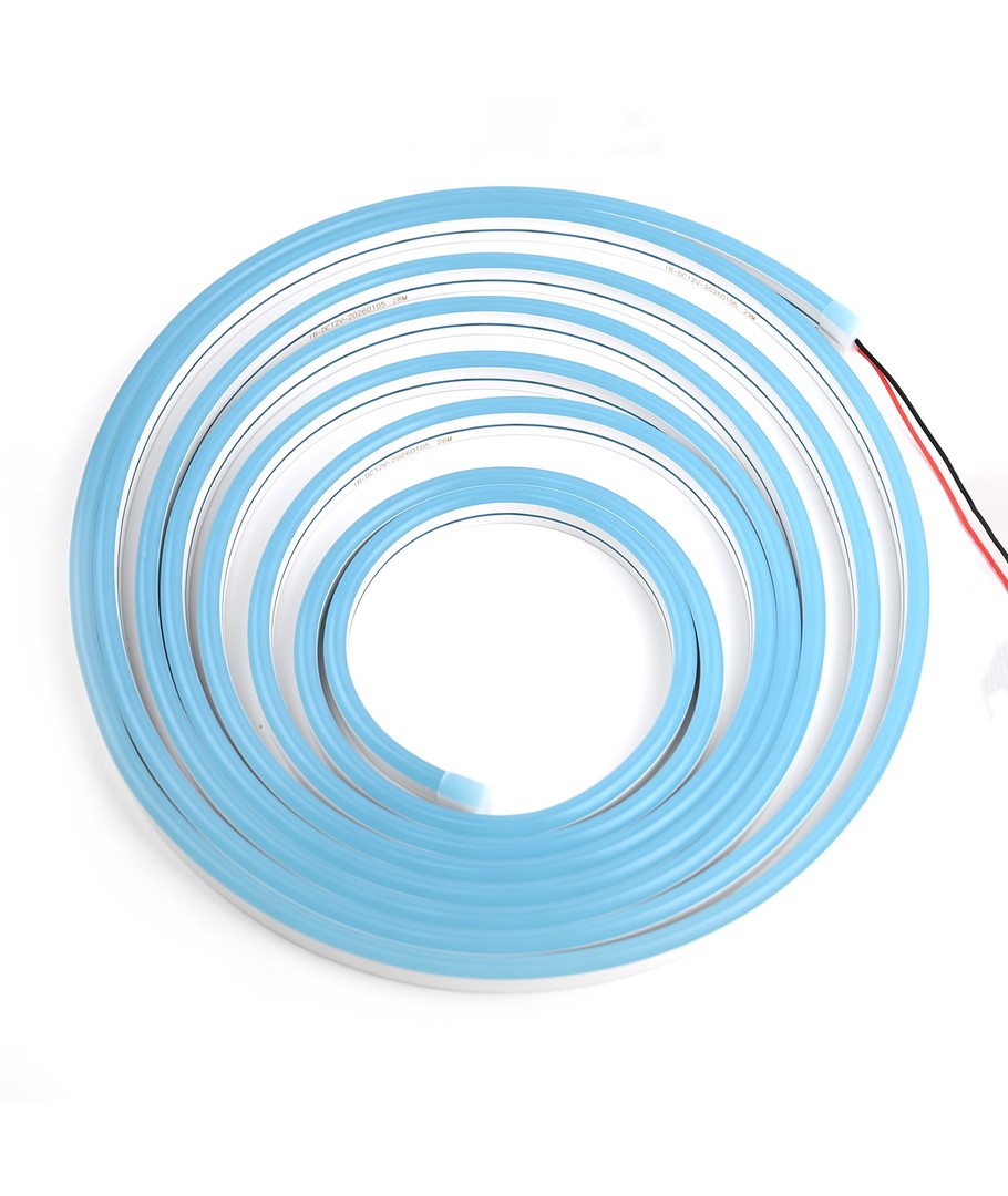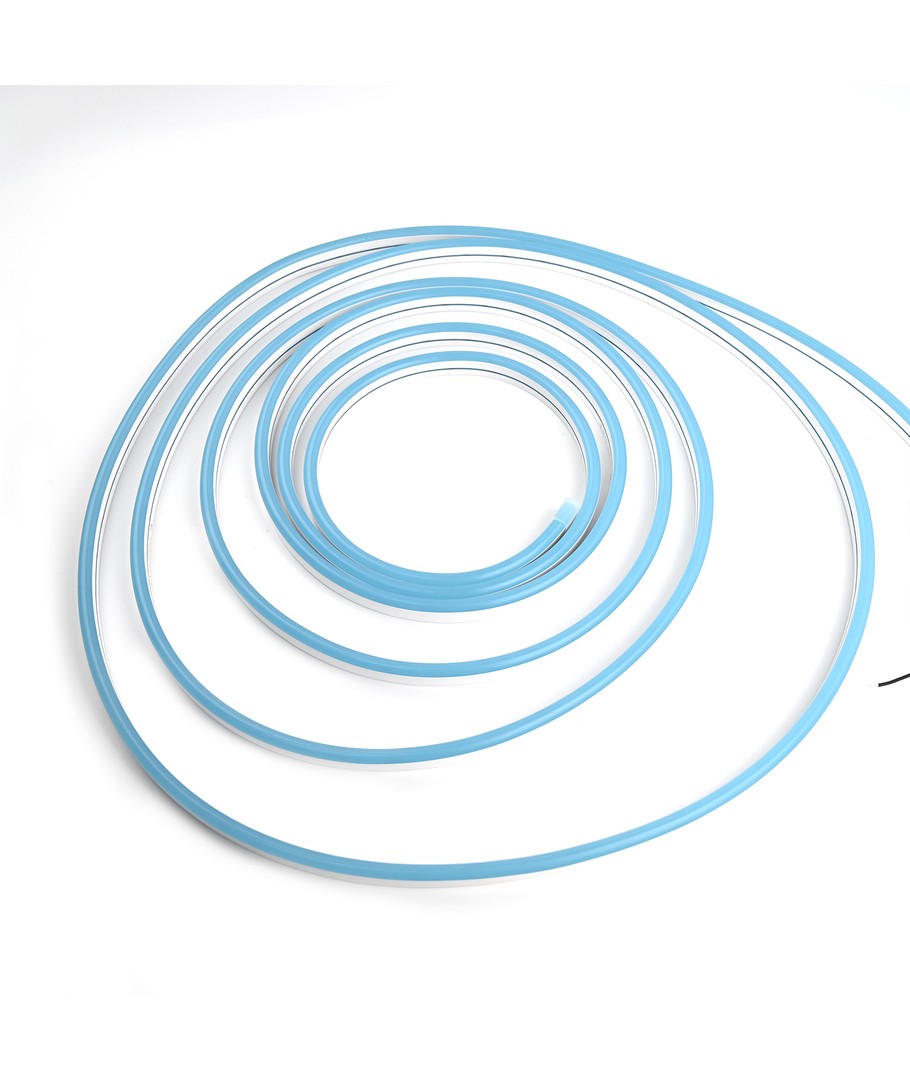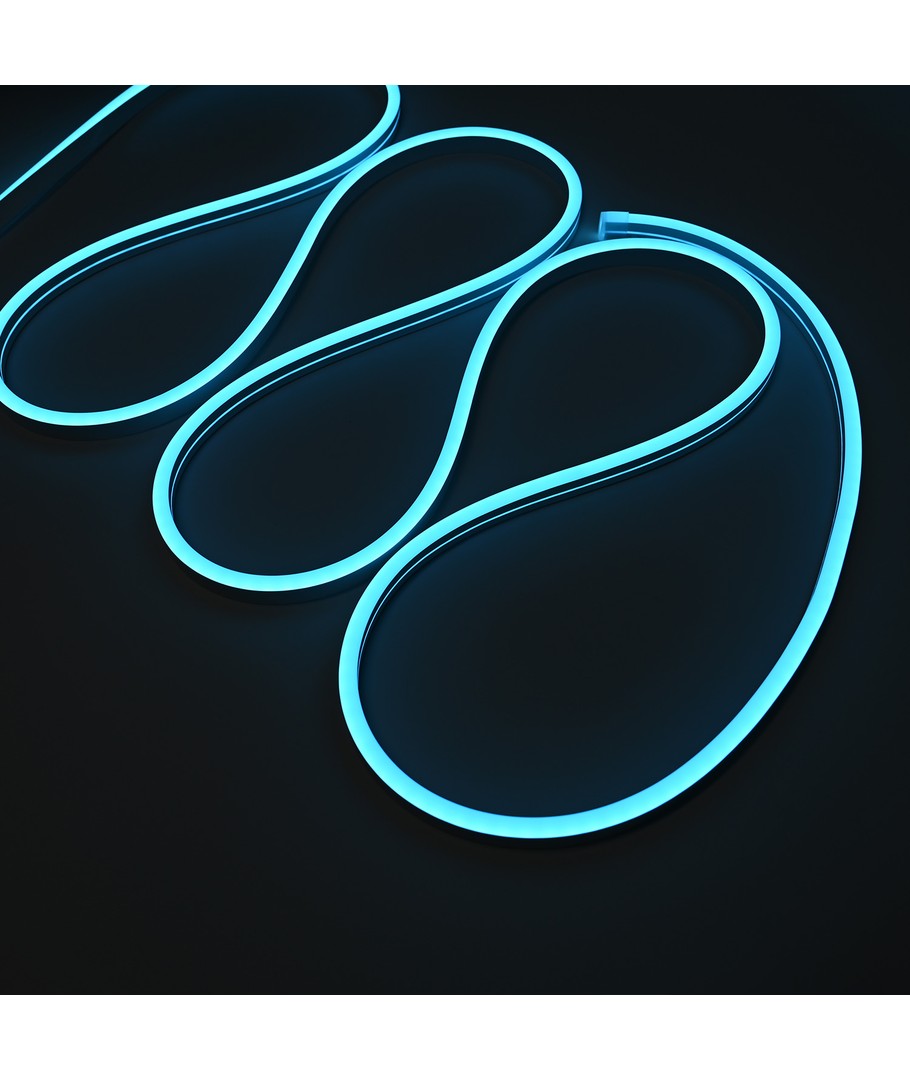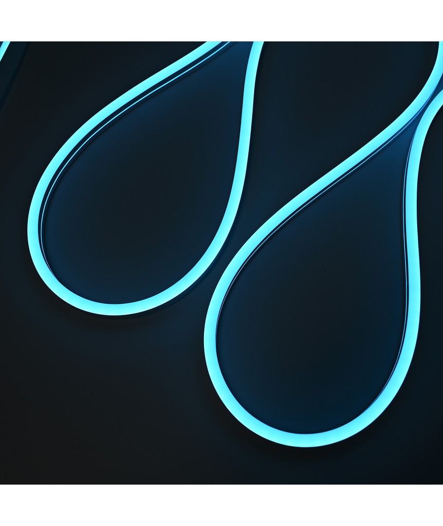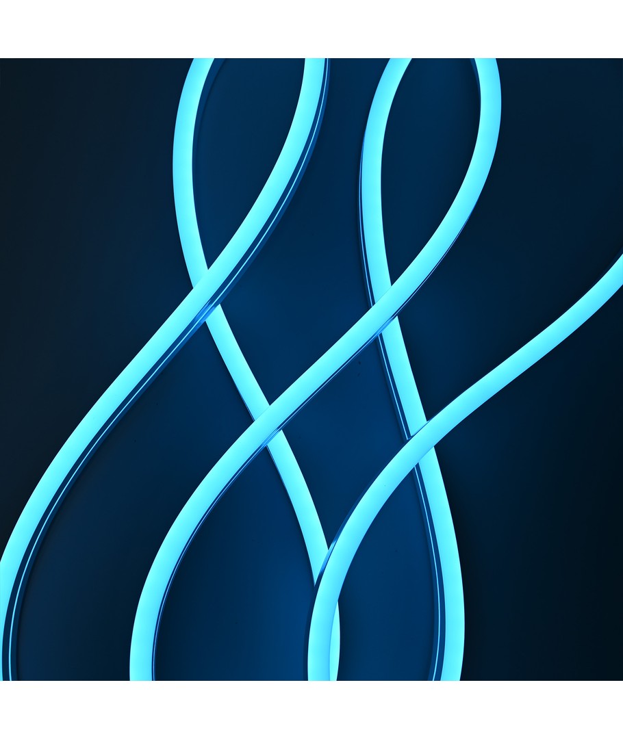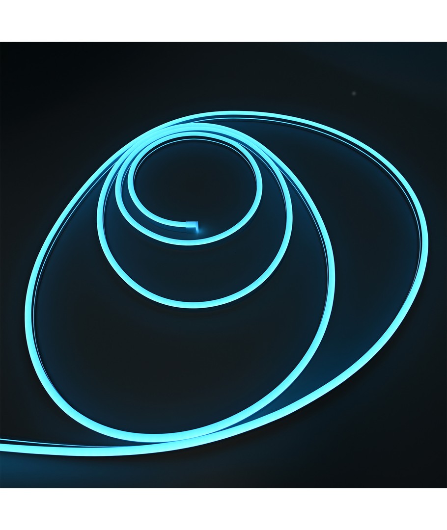 Vår lyseblå 5m 8W/m Neon Flex LED stripe lyser opp ethvert rom med en farge som er både beroligende og stilig. Med en imponerende lysstyrke på 355 lumen/meter og en spredning på 100 grader, fordeles lyset jevnt for å skape en innbydende atmosfære.