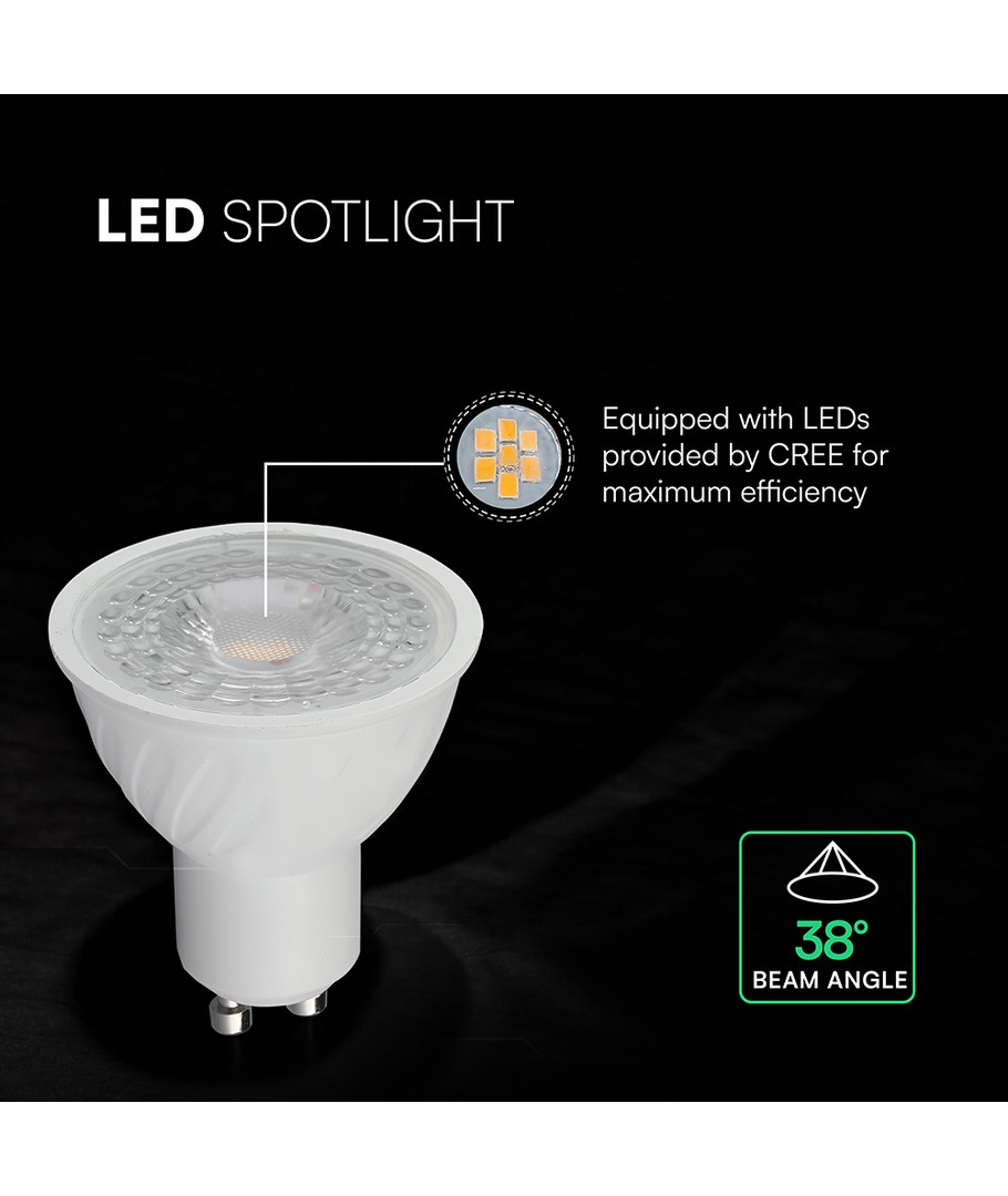 Den er utstyrt med en 4.5W GU10 fatning og benytter en pålitelig Cree-chip for optimal ytelse. Denne spotlighten gir en lysstrøm på 345 lumen med et fokusert lys på 38 grader, som sikrer et kontrollert lysbilde som perfekt fremhever detaljer i rommet.