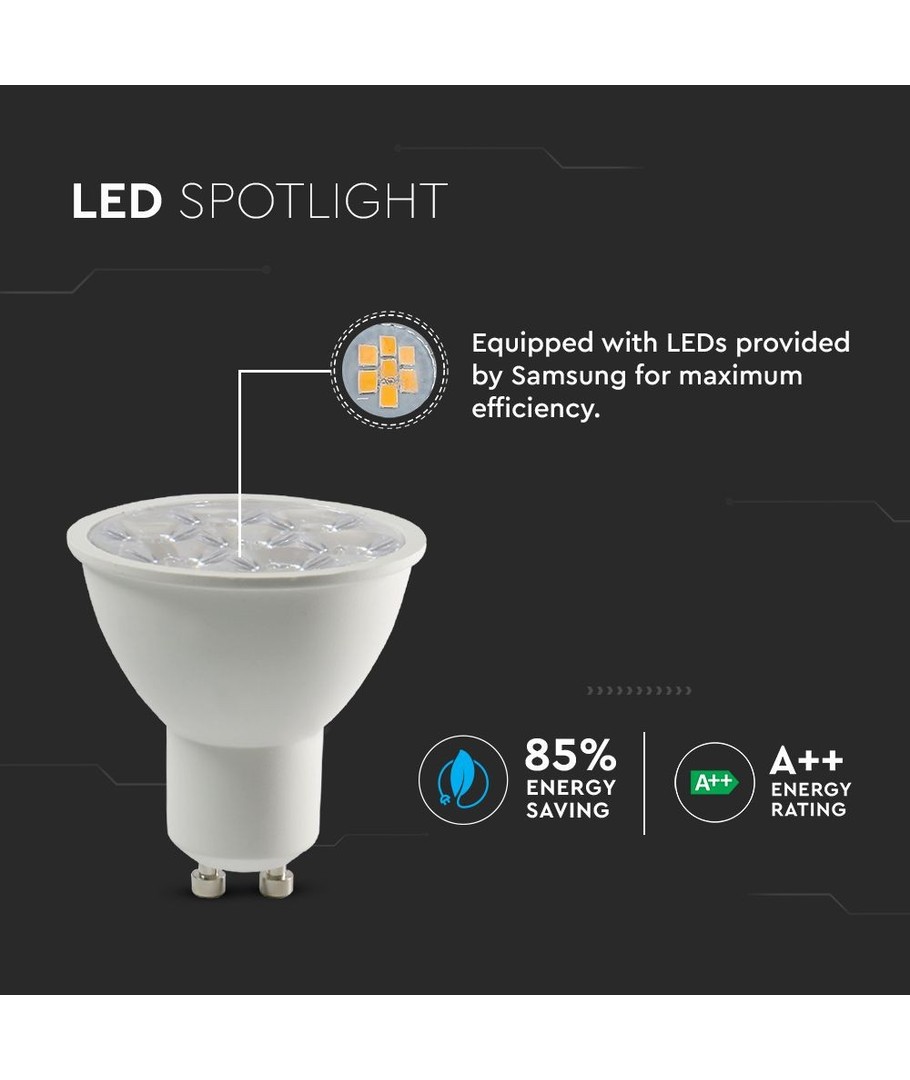Det er utstyrt med en Samsung LED chip og en GU10 fatning som erstatter tradisjonelle 50W spot.