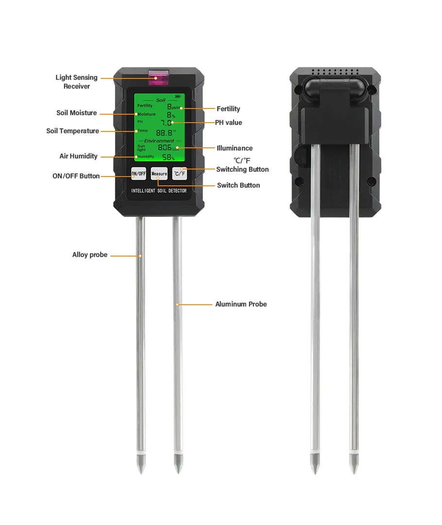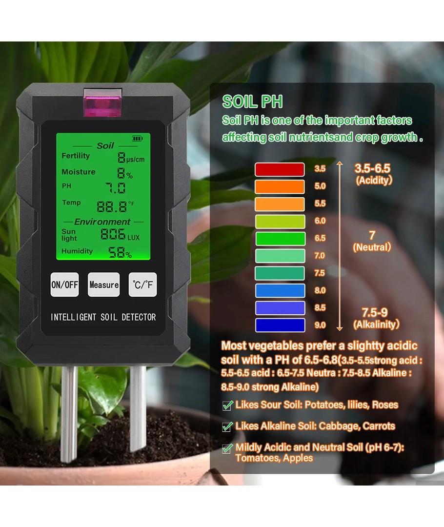 Opplev presisjon og allsidighet med vår 6 i 1 måler, som forenkler pleien av plantene dine ved å måle pH, fuktighet, temperatur, lysintensitet, næringsinnholdet i jorden samt luftfuktighet i én kompakt enhet.