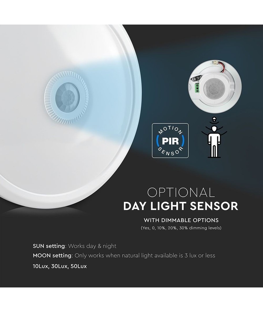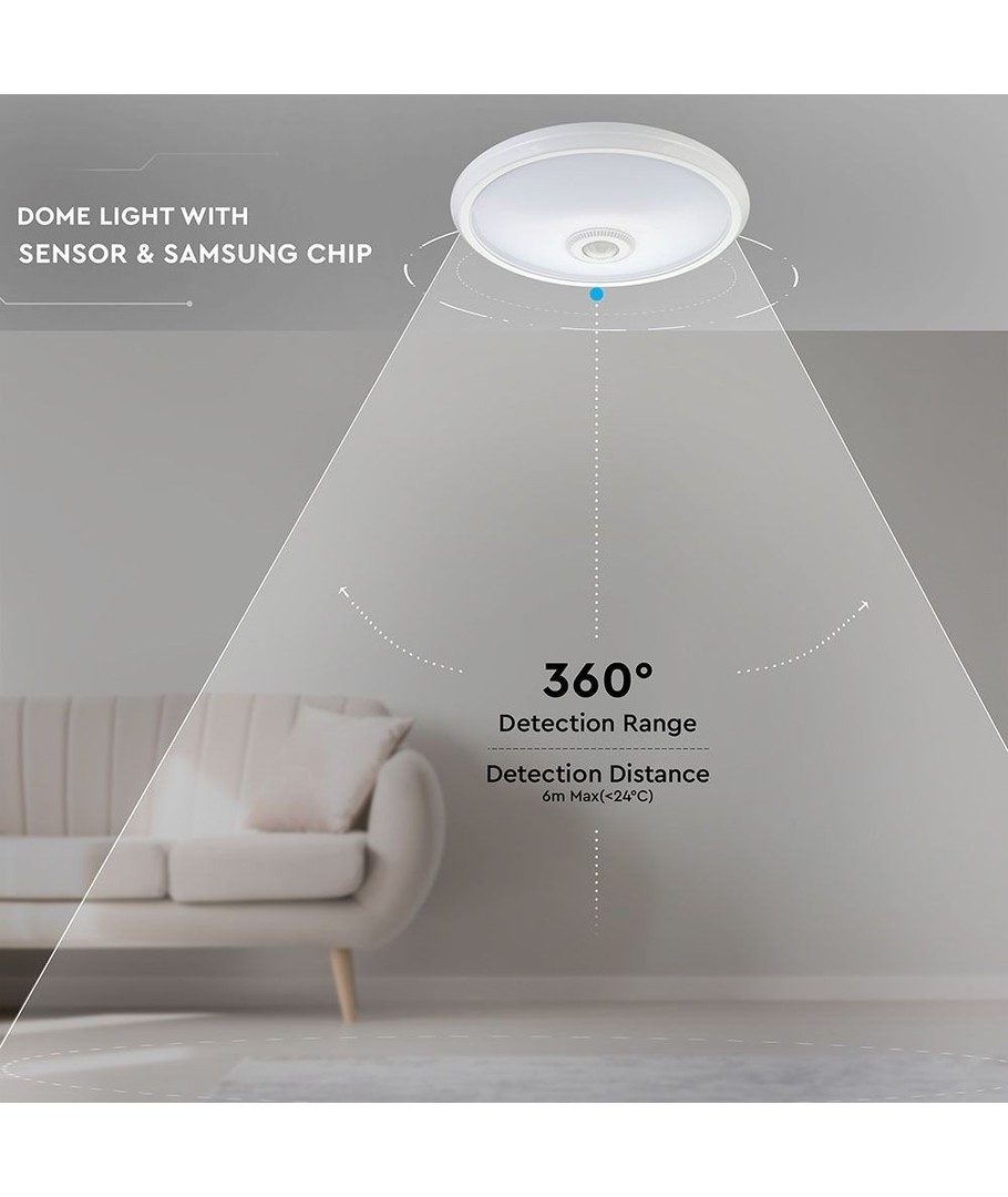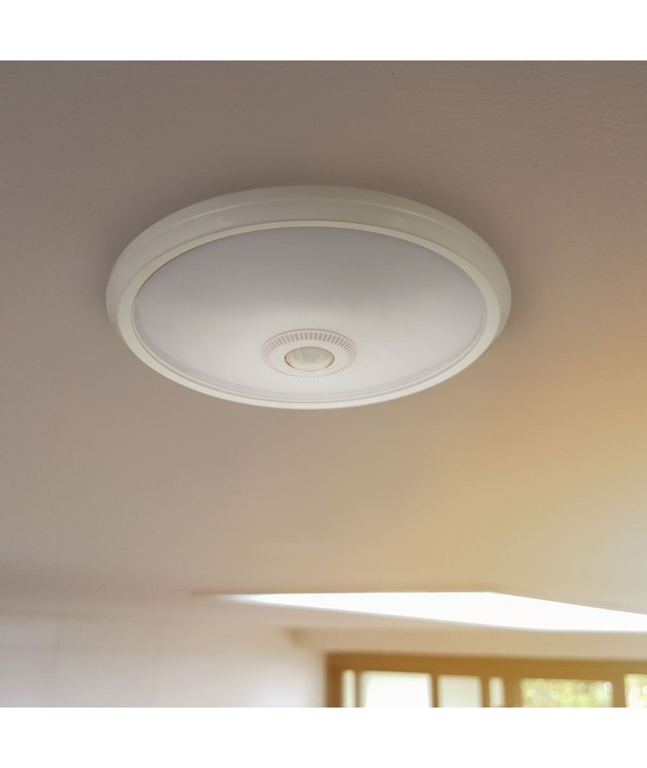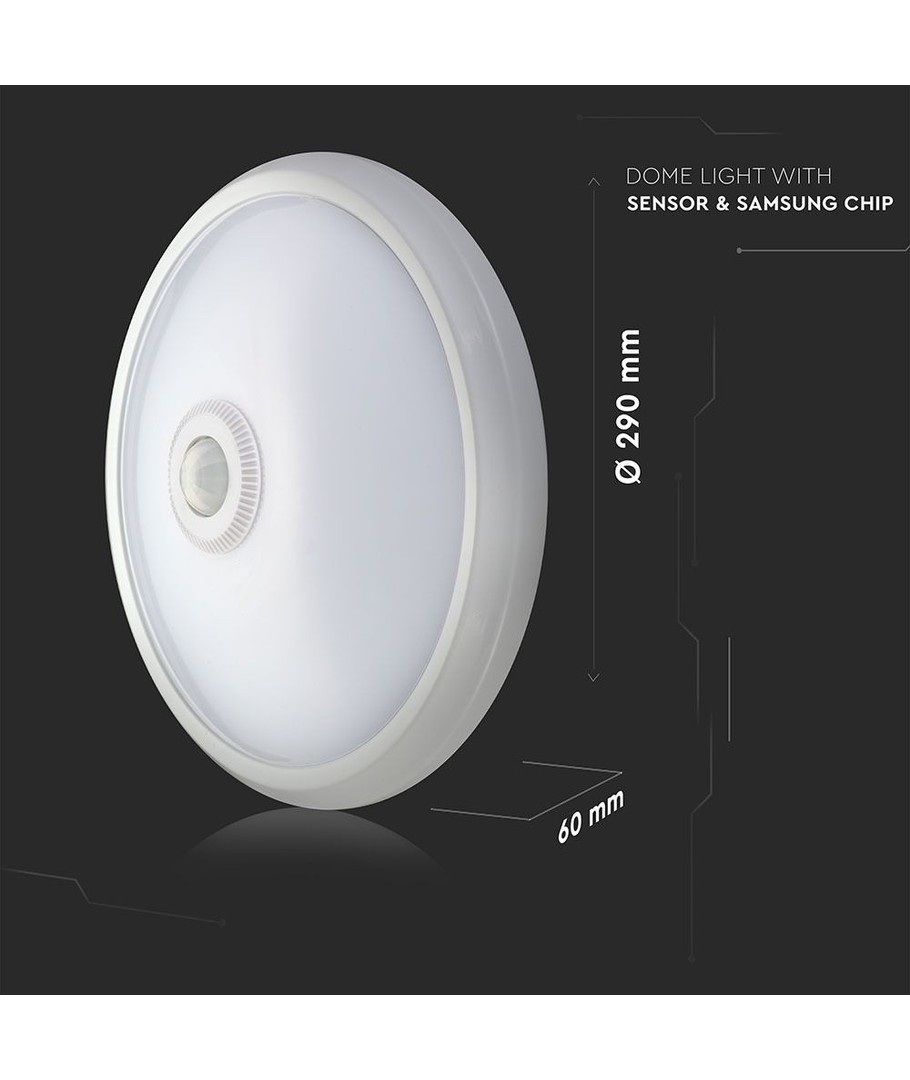 Lampen har en kompakt utforming med dimensjoner på 60 x Ø290 mm og er utstyrt med en PIR-sensor, noe som gjør den ideell for bruk i områder der du ønsker at lyset skal aktiveres automatisk ved bevegelse.