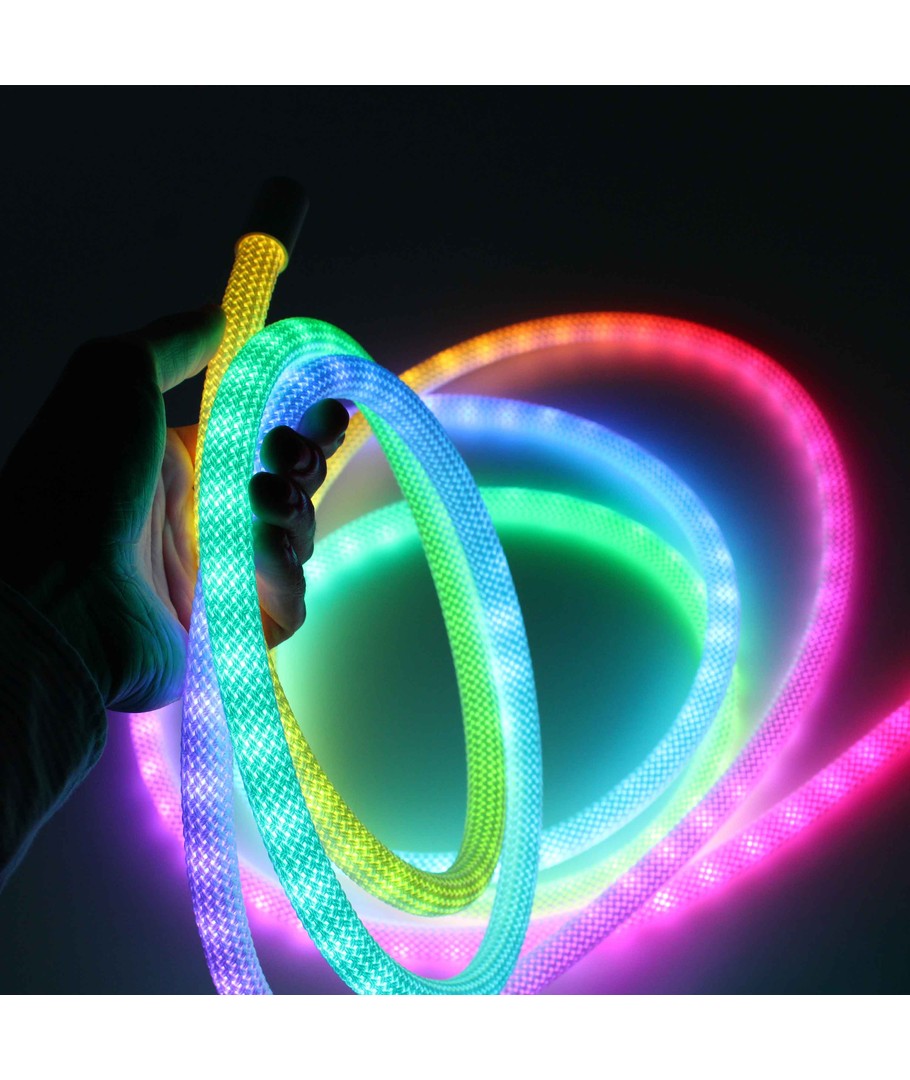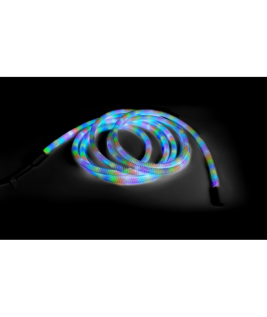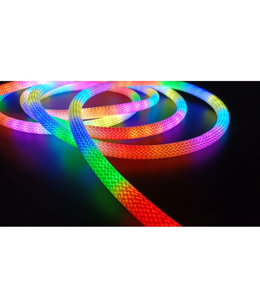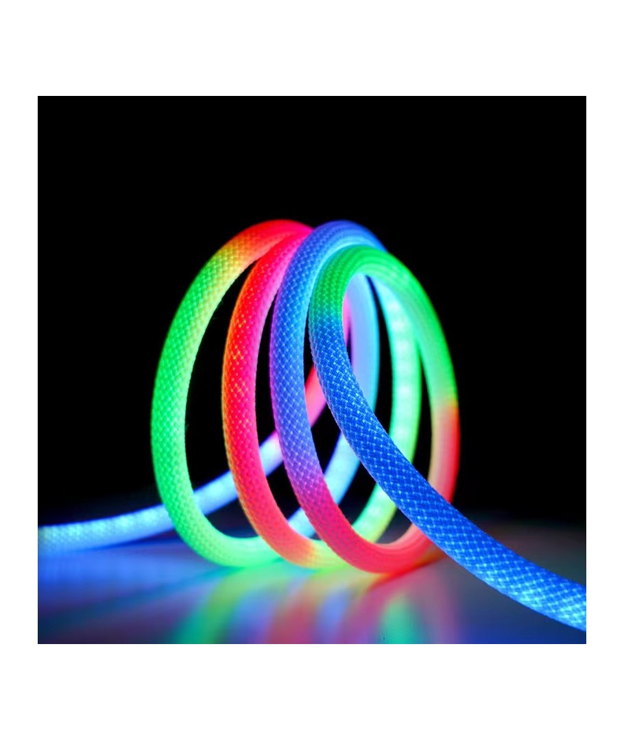 Opplev en verden av farger med vår 3W/m RGBIC Neon Flex strip med vevd tau - en 5 meter RGBIC neon flex, som bringer lys og liv til ethvert rom med sitt dynamiske fargespill og fleksible design.