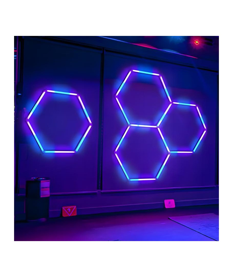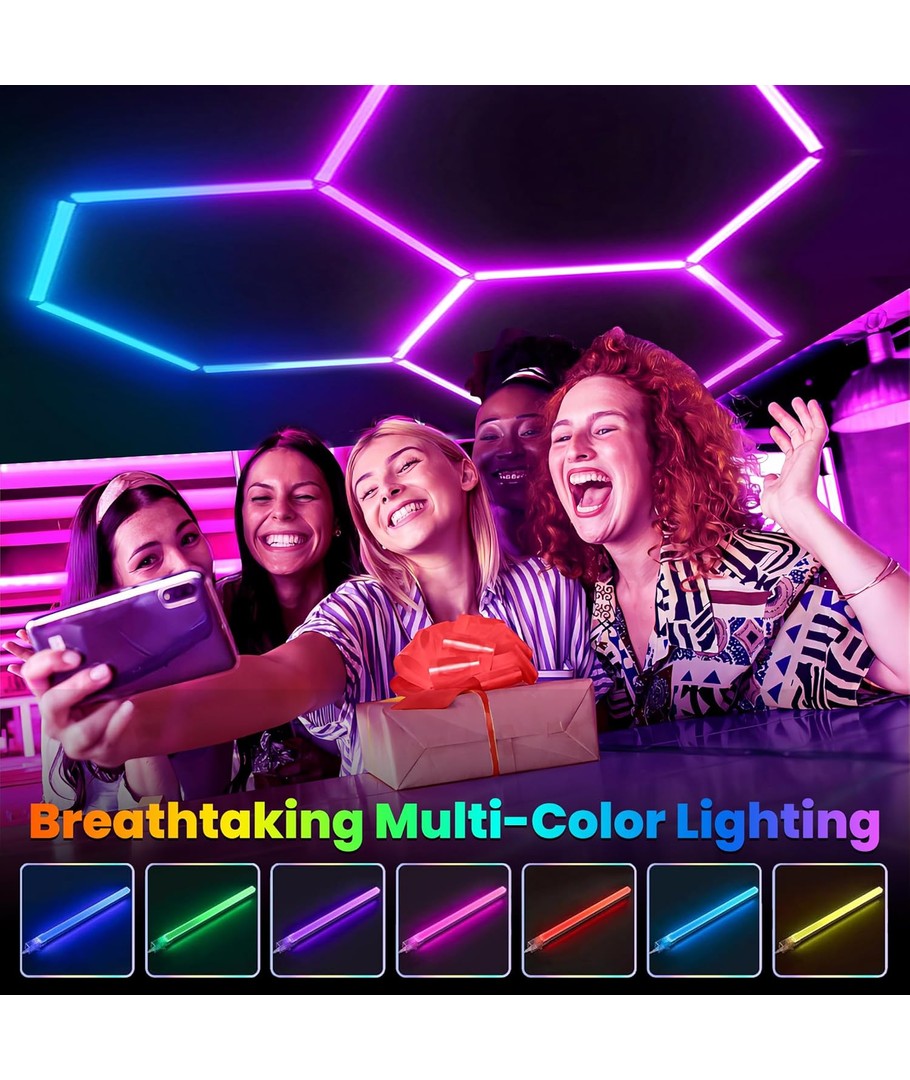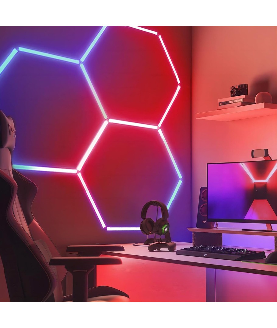 Med dette settet kan du enkelt forbedre belysningsatmosfæren i ethvert rom. Perfekt for stuen, soverommet eller kontoret, og muliggjør en tilpasset opplevelse som tilpasses ditt humør og miljø. Hexagon RGBIC 3 felt komplett sett er det ideelle valget for å bringe kreativitet og moderne stil til hjemmet ditt.