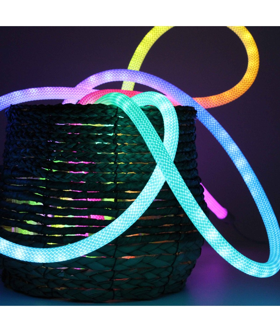 Opplev en verden av farger med vår 3W/m RGBIC Neon Flex strip med vevd tau - en 3 meter RGBIC neon flex, som bringer lys og liv til ethvert rom med sitt dynamiske fargespill og fleksible design.