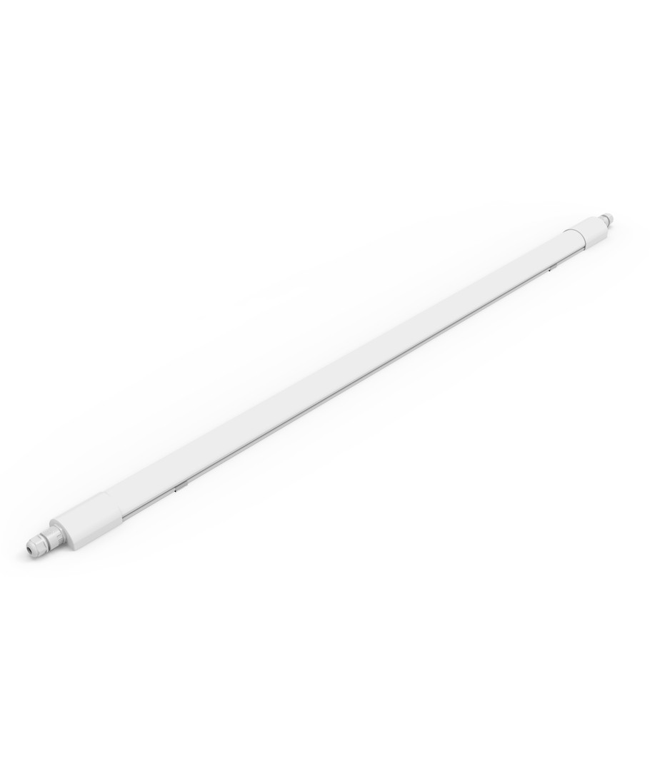 Målene på armaturen er 34 x 45 x 1200 mm, og den kommer med en integrert lyskilde. Takket være IP65-kapslingen er den godt beskyttet mot vannsprut og regn, noe som gjør den velegnet for både innendørs og utendørs bruk.