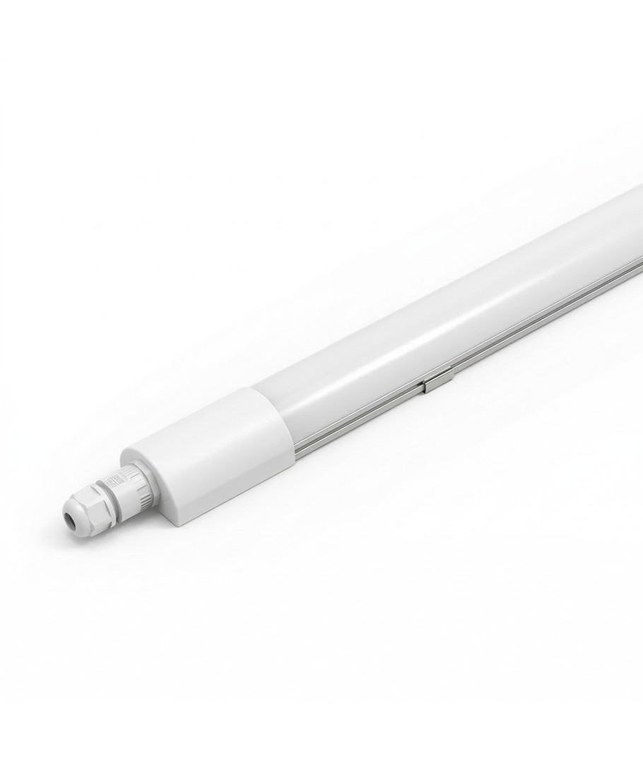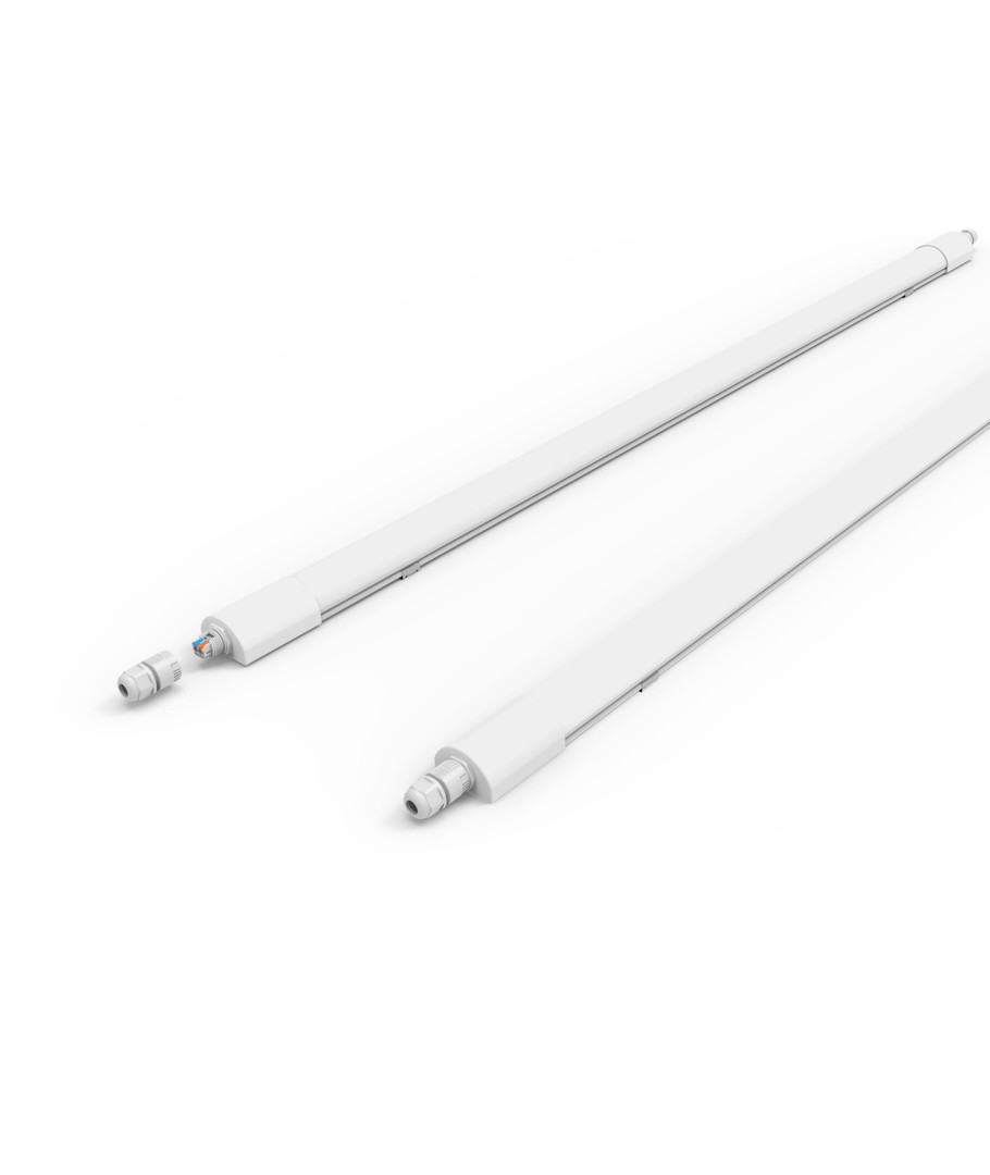 Målene på armaturen er 34 x 45 x 1200 mm, og den kommer med en integrert lyskilde. Takket være IP65-kapslingen er den godt beskyttet mot vannsprut og regn, noe som gjør den velegnet for både innendørs og utendørs bruk.