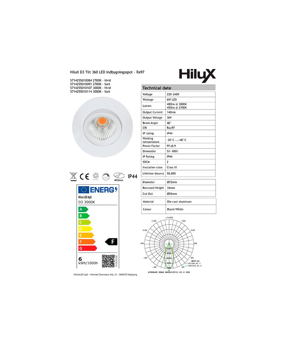 Uansett om du ønsker å belyse stuen, kjøkkenet, badet eller en eksklusiv butikk, vil HiluX D3 Tilt360 levere overlegen ytelse og enestående lyseffekter gang på gang. Dra nytte av teknologien som får frem den sanne skjønnheten i omgivelsene dine og skaper en varm, naturlig atmosfære. Utforsk uendelige belysningsmuligheter med denne førsteklasses LED-innfellingsspotten.