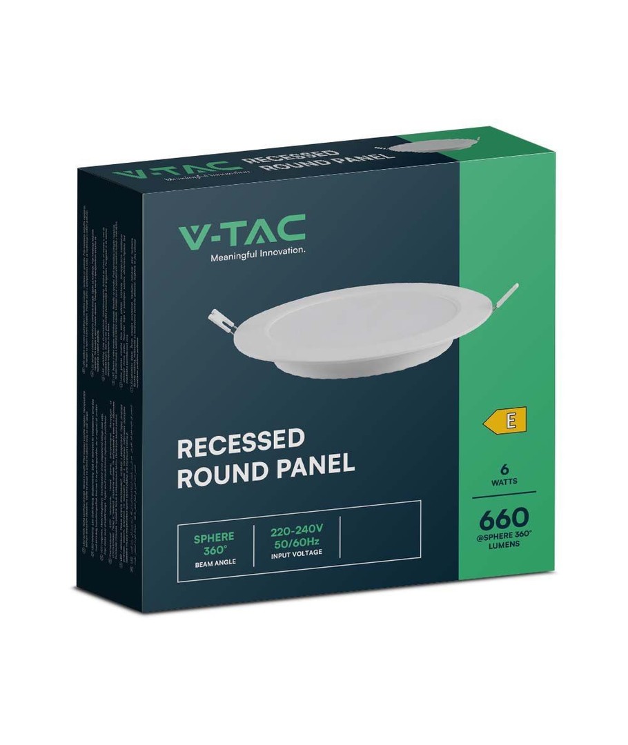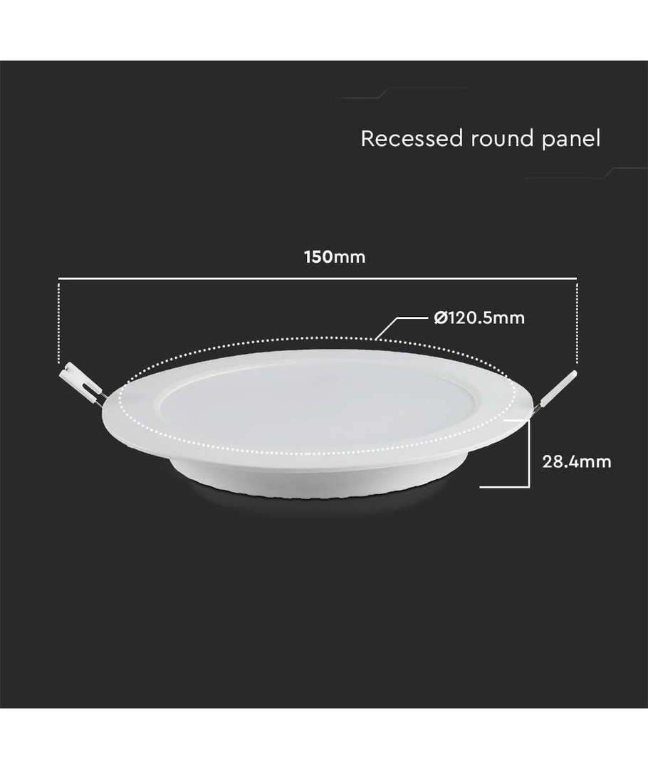 V-Tac 6W LED panel downlight er enkel å installere med dimensjoner på 28,4 x Ø120,5 mm og en nødvendig hullstørrelse på Ø110 mm. Den må kobles til en 230V forsyning, og er dermed ideell for standard europeiske elektriske systemer.