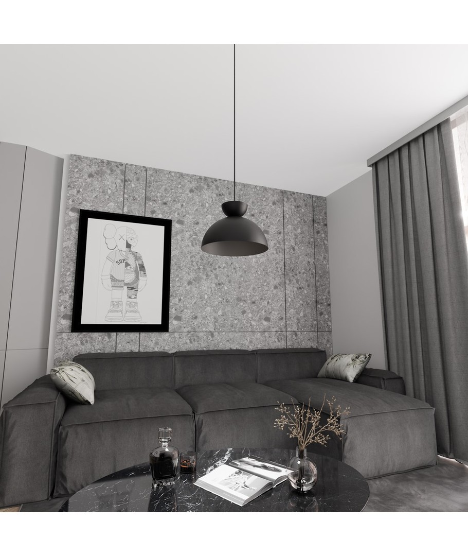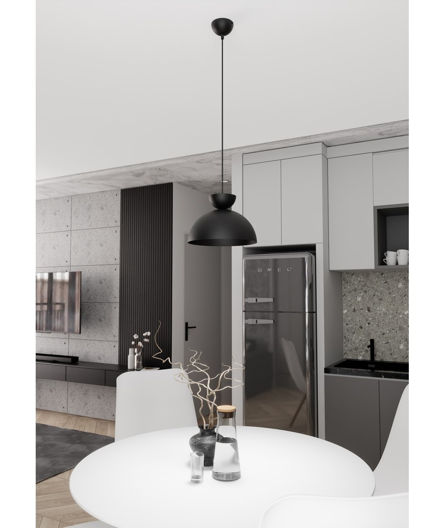 Lunaro 1S Sort pendellampe kombinerer moderne minimalisme med tidløs stil og tilfører eleganse til ditt hjem. Med sin harmoniske, halvkuleformede skjerm, som minner om månens form, skaper den en koselig og atmosfærisk belysning. Denne lampen er perfekt integrert i enhver innredning, fra moderne loftmiljøer til klassiske arrangementer. Den matte overflaten fremhever lampens sofistikerte design, og den justerbare opphengslengden gjør den ideell over spisebordet, i stuen eller soverommet.