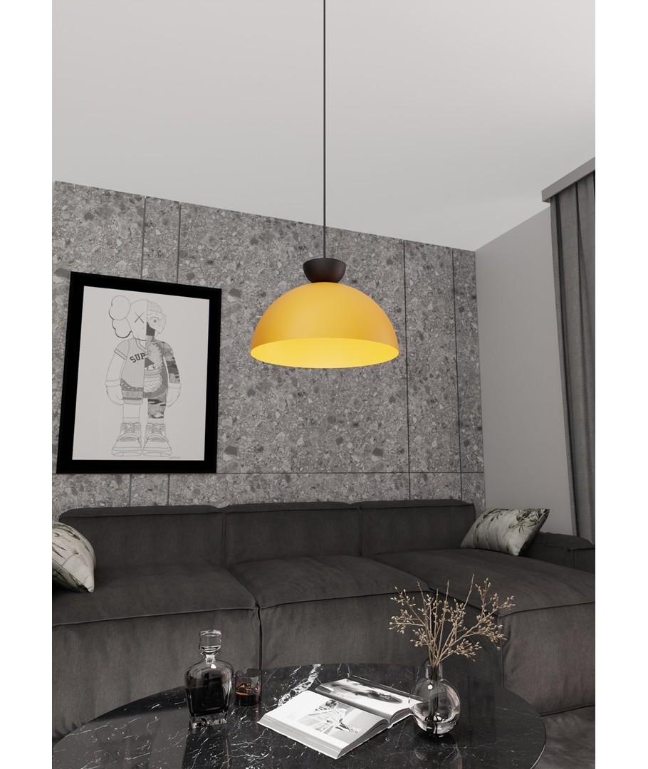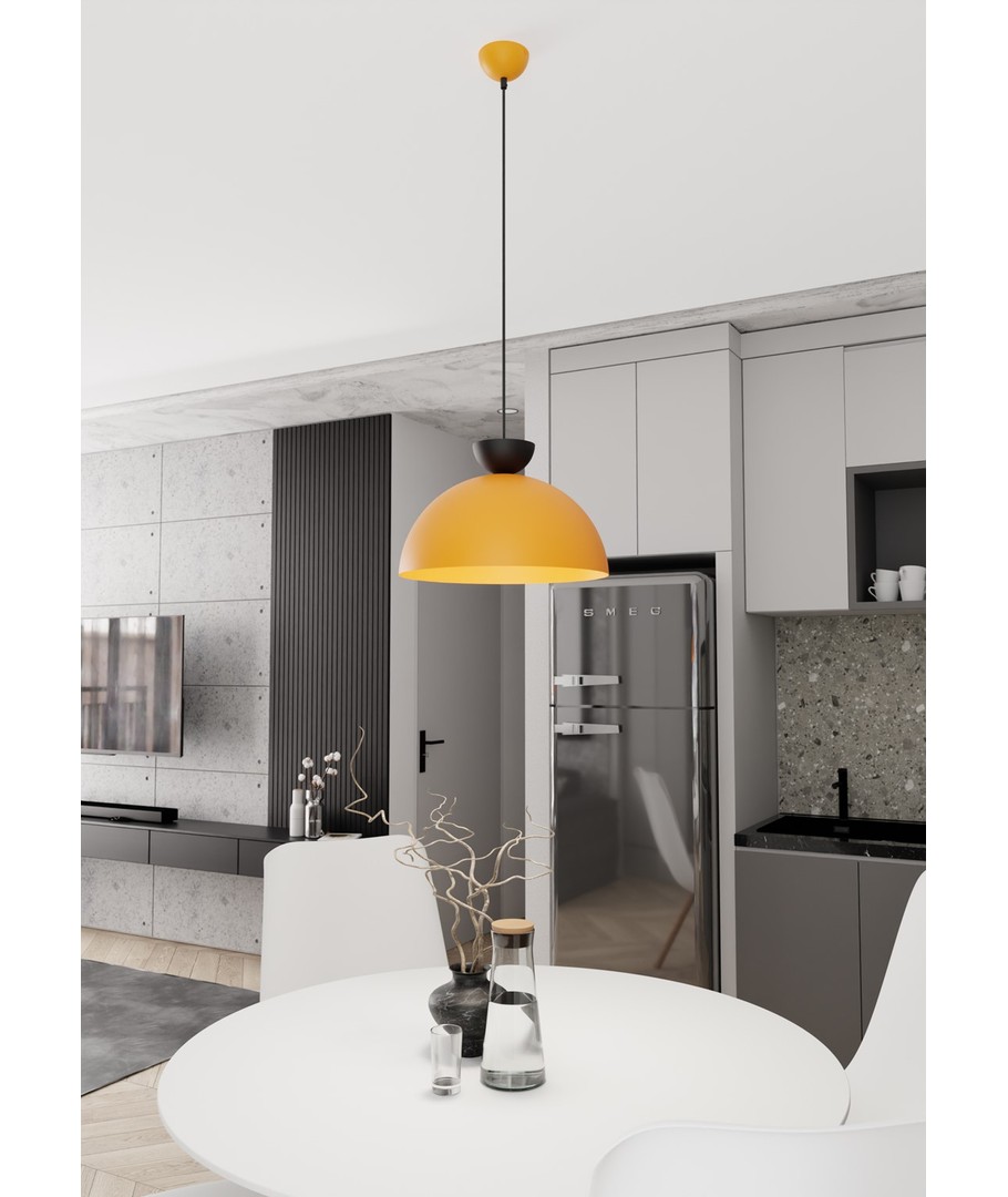 Lunaro 1L Sort/Oransje pendellampe er en elegant kombinasjon av moderne minimalisme og tidløs stil. Dens harmoniske, halvkuleformede skjerm minner om månens form, og skaper en koselig og atmosfærisk belysning som passer vakkert inn i enhver innredning. Fra moderne tak til klassiske arrangementer kan denne lampen berike ethvert rom med sin matte finish og sofistikerte design. Lunaro-lampen har justerbar opphengslengde, noe som gjør den perfekt over spisebordet, i stuen eller soverommet.