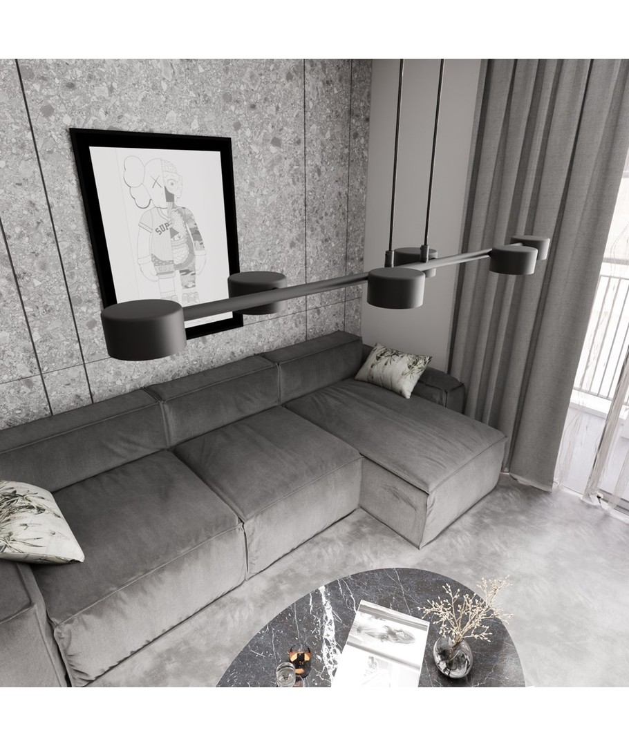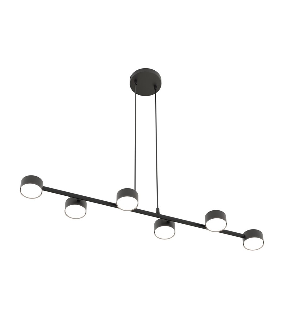 Megara 6 Sort pendellampe tilbyr en moderne belysningsløsning med et minimalistisk design, som tilfører et stilrent uttrykk til ditt hjem. Lampens seks sylindriske sokler er jevnt fordelt på en horisontal stang, som gir en utmerket lysfordeling. Med en elegant matt sort finish og justerbar høyde kan lampen tilpasses ulike rom, noe som gjør den ideell for både stue, spisestue og kontor. Megara 6 pendellampe er ikke bare en funksjonell lyskilde, men også en dekorativ tillegg som kombinerer stil med funksjonalitet.