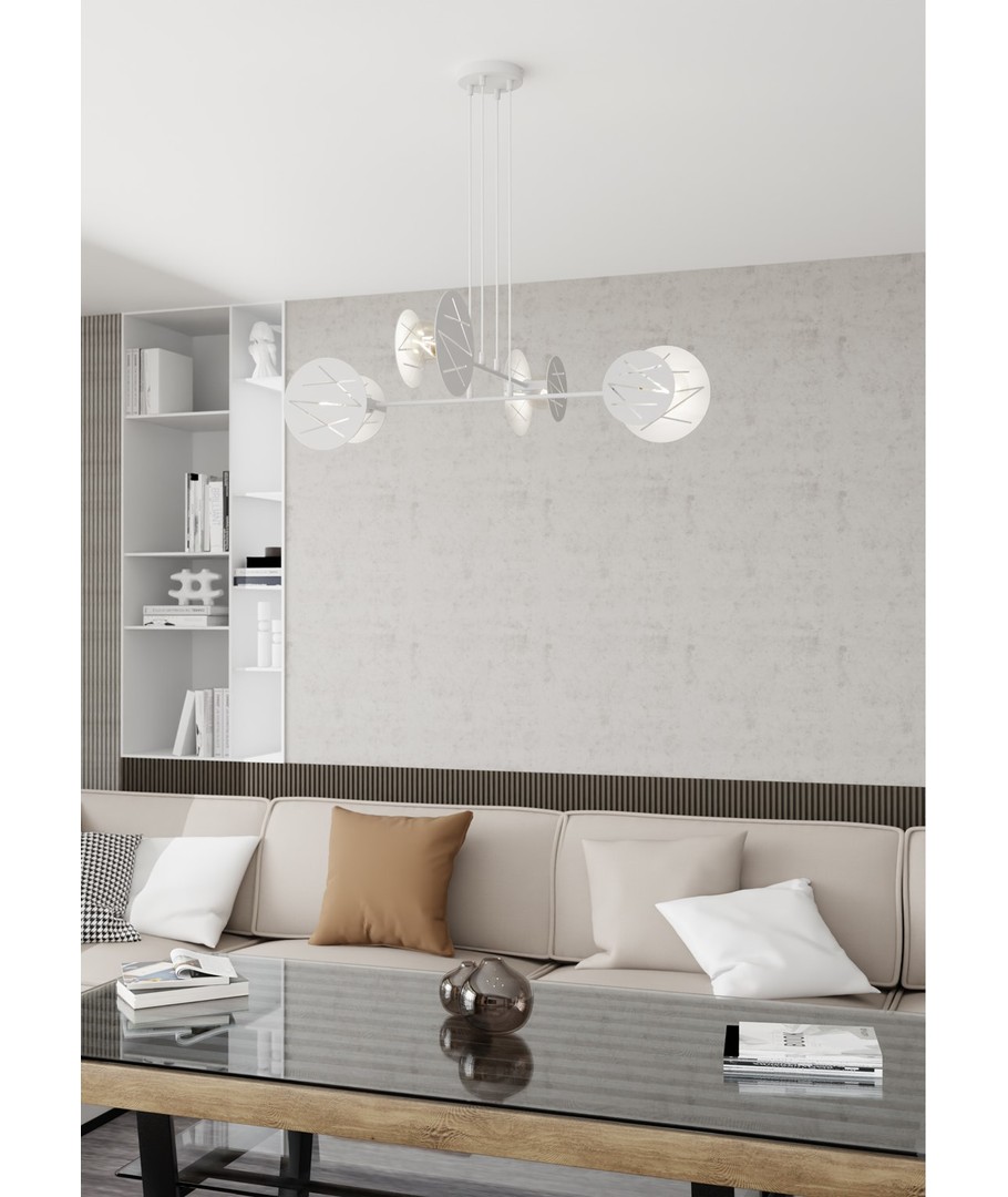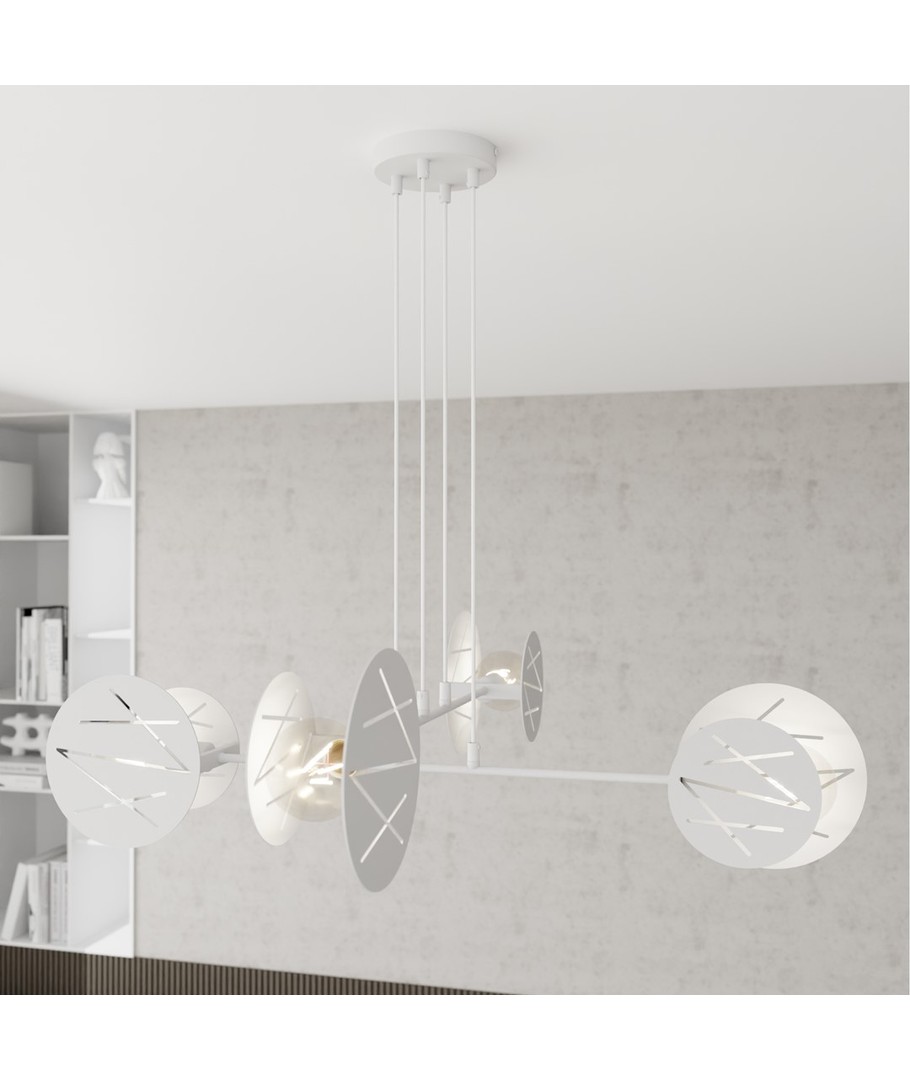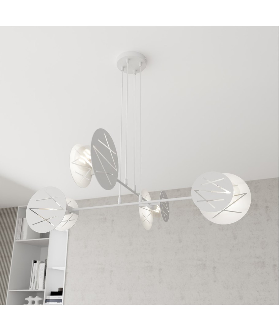 Xotic 4 Hvit pendellampe er en moderne belysningsløsning, som utmerker seg med sitt geometriske design og unike laserutskårne detaljer på metaloverflaten. Med sin originale form tilfører lampen et moderne preg til enhver innredning, enten det er i stuen, spisestuen eller på kontoret. Den gir fra seg et imponerende lys, som fremhever dens innovative stil, og er derfor det perfekte valget for de som verdsetter enestående design og håndverk av høy kvalitet.