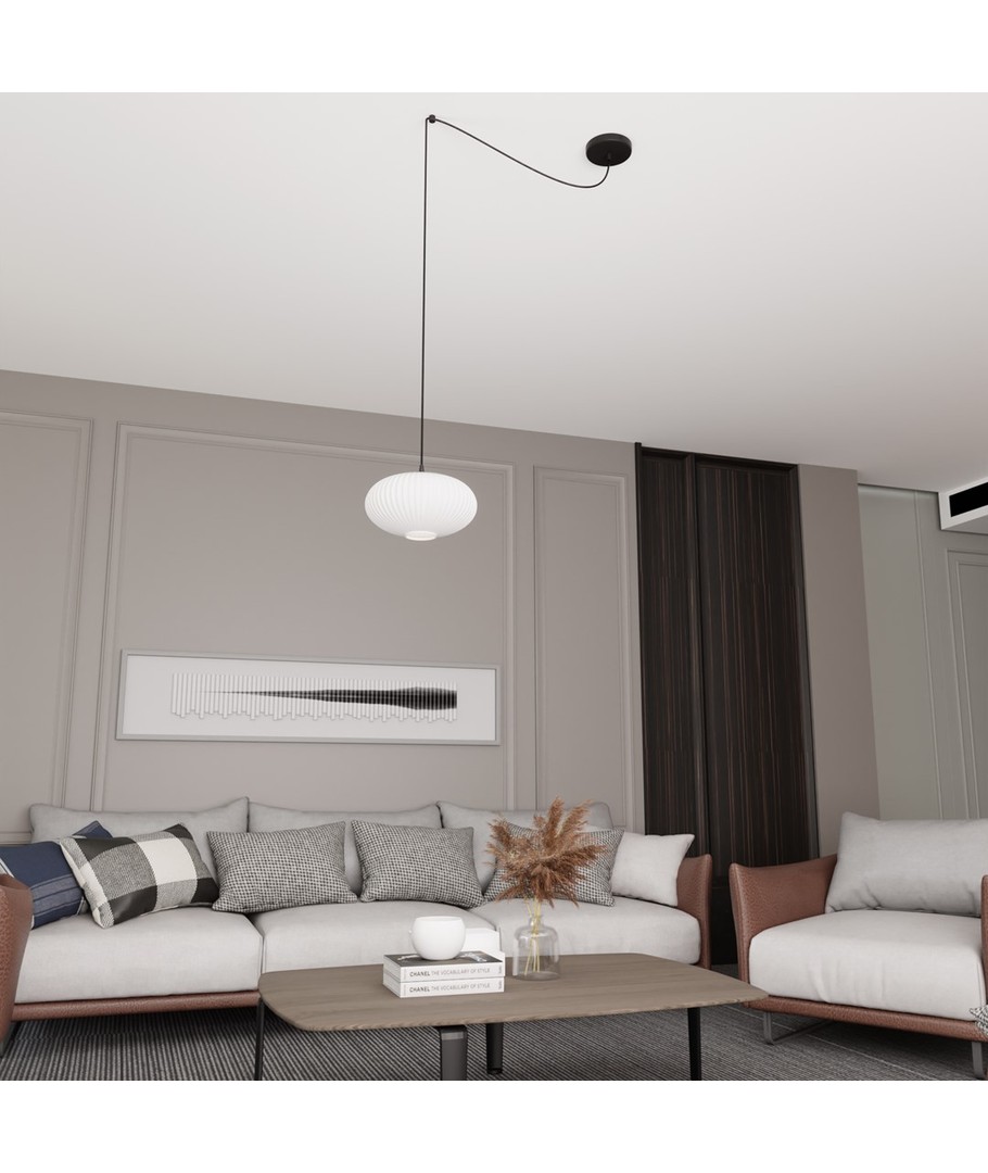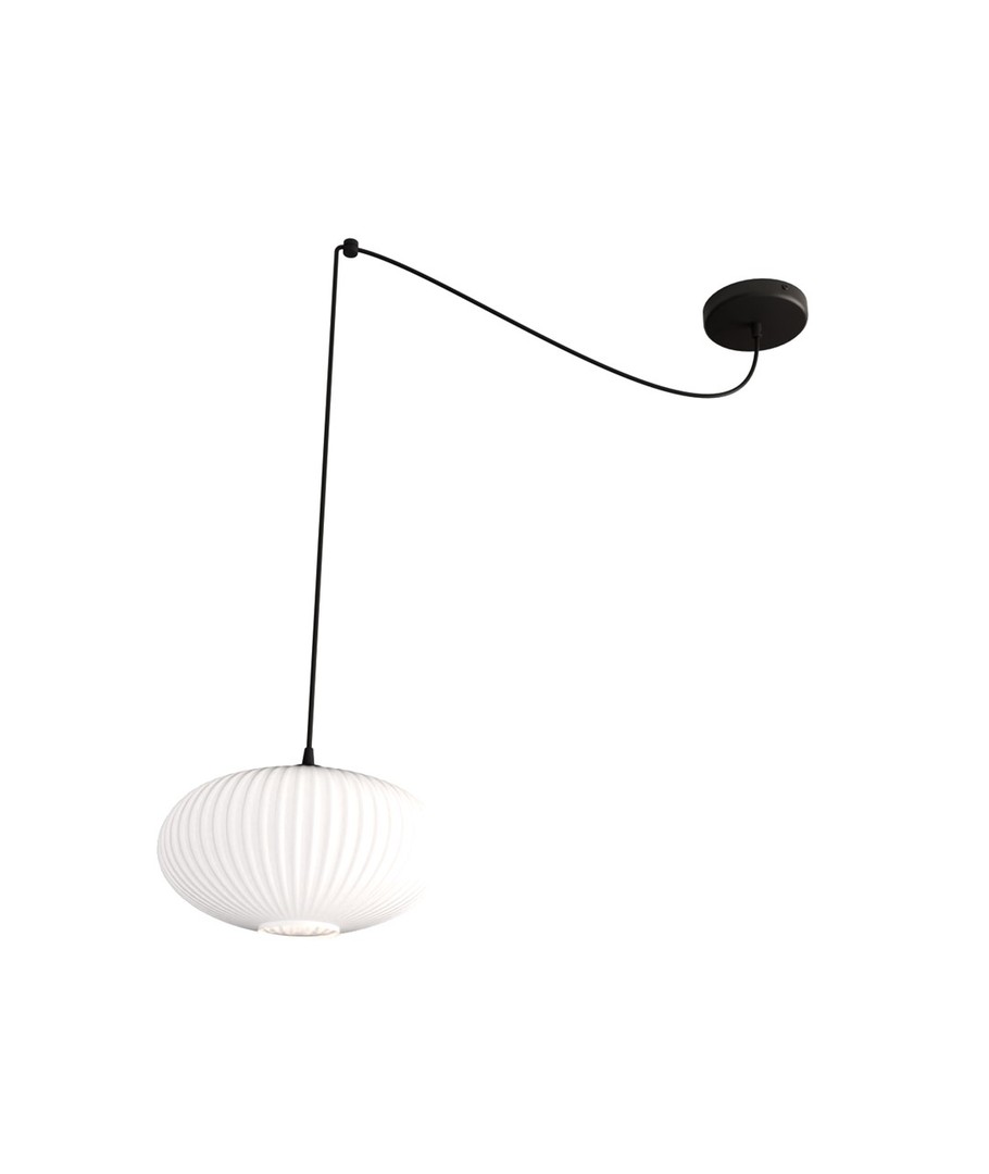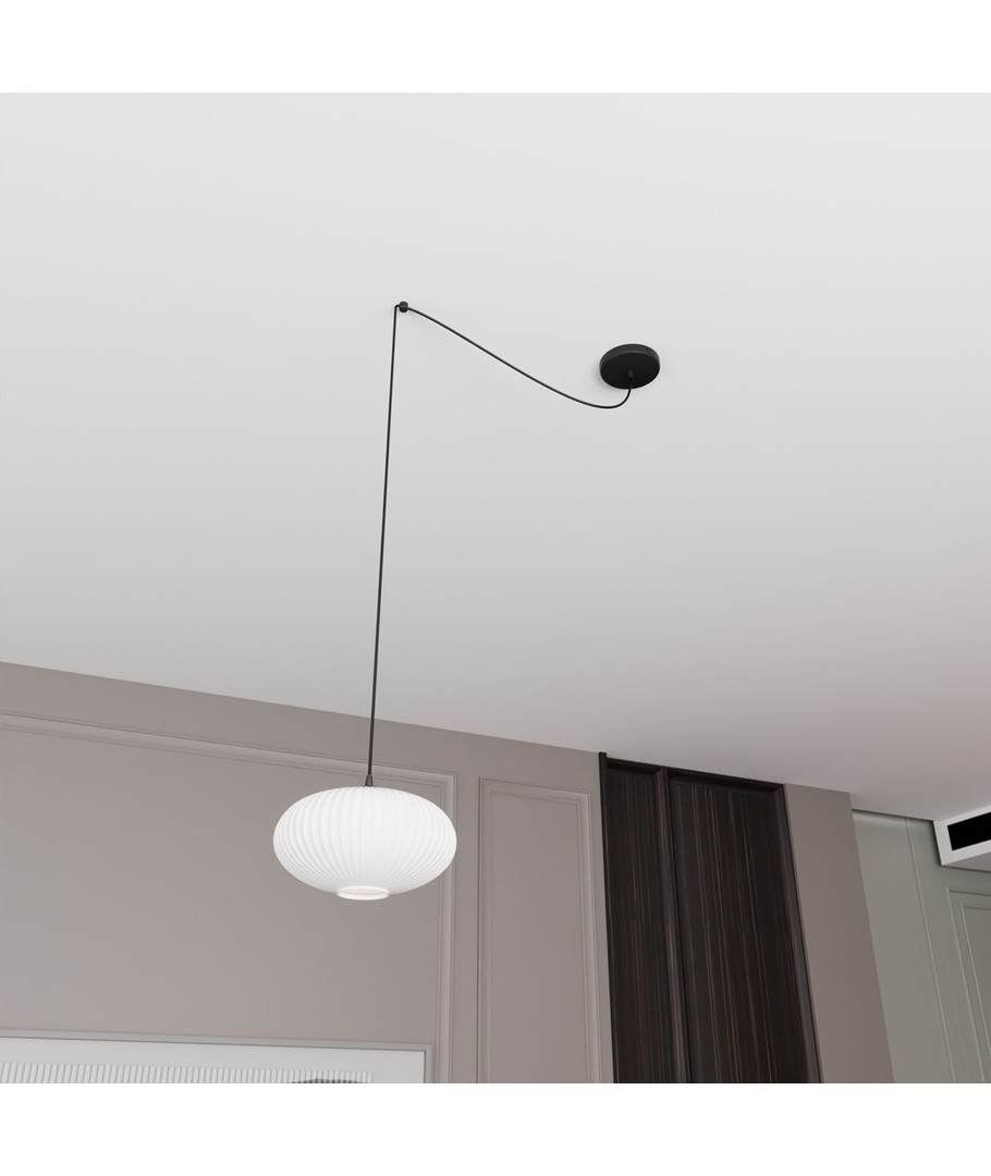Lampen er enkel å tilpasse til din stil, takket være den justerbare pendellengden og tidløse kombinasjonen av sort og opalglas.