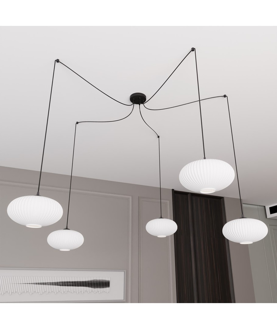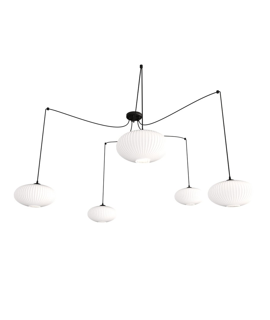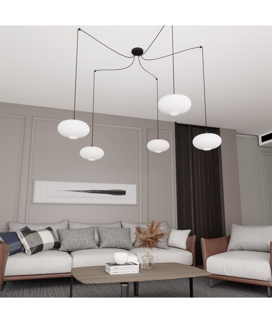 Origo 5 Sort/Opal pendellampen kombinerer moderne design med praktisk funksjonalitet, hvilket gjør den til et sentralt element i ethvert rom. Dens elegante, ekspansive armer og skjerm av opalglass skaper en harmonisk helhet, som bringer varme og stemning inn i hjemmet eller næringslokaler som restauranter. Med sitt estetiske uttrykk og høye kvalitet er Origo lampen den ideelle belysningsløsningen, hvor stil og funksjonalitet møtes.
