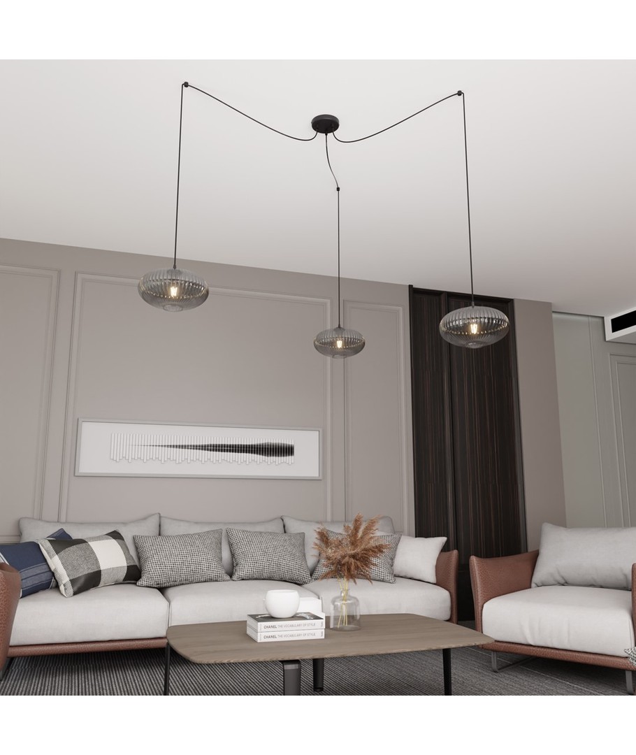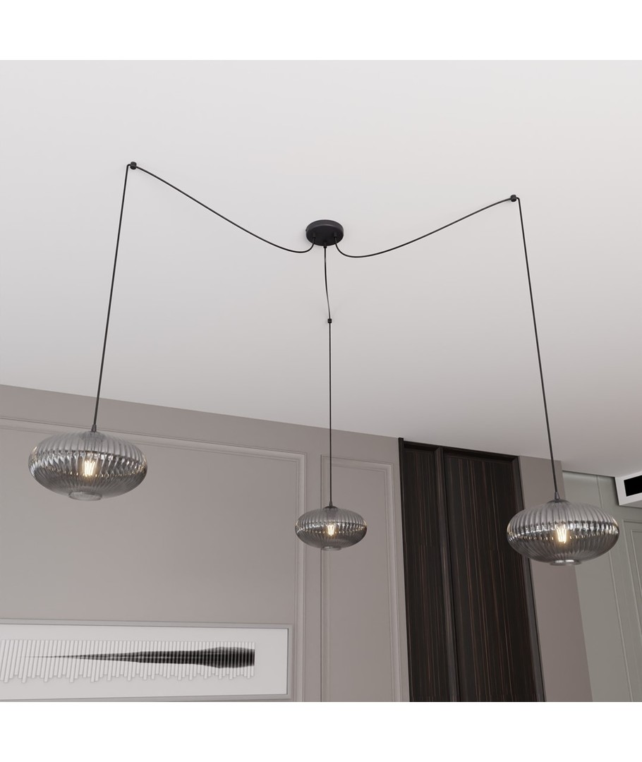 Opplev det stilfulle og funksjonelle designet av Origo 3 Sort/Grafitt pendellampe, som passer perfekt inn i ethvert moderne hjem eller kommersielt rom. Med sine tre brede armer og elegante glasskjermer skaper denne lampen en varm og innbydende atmosfære, ideell for både stuer og restauranter. Den innovative kombinasjonen av estetikk og kvalitet gjør Origo-lampen til et opplagt valg når du ønsker å tilføre rommet et sofistikert preg.