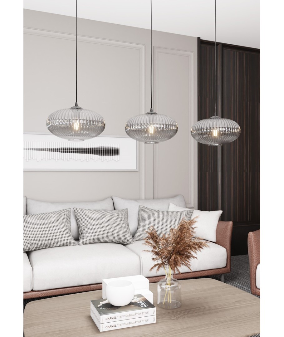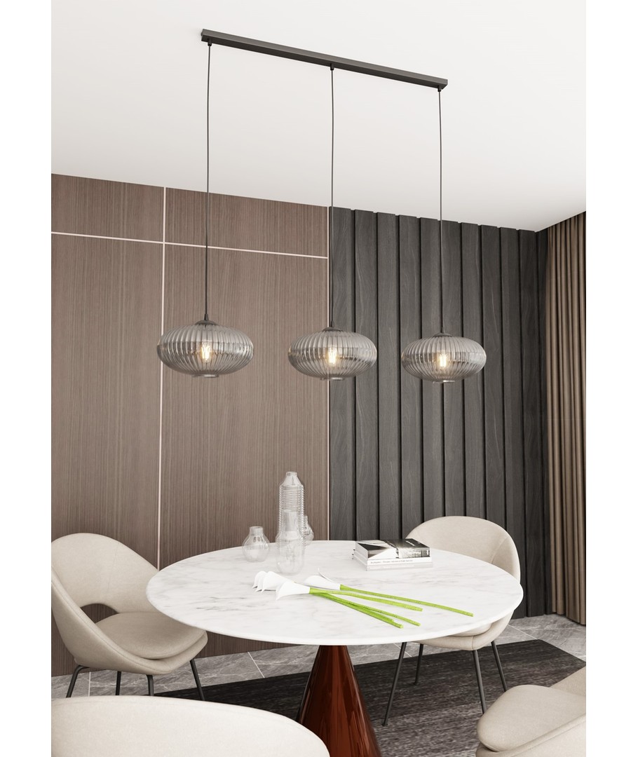 Coco 3 Sort/Grafit pendellampen kombinerer moderne eleganse med funksjonalitet. Med sine vakre glasskjermer utstråler den et varmt lys som tilfører en letthet og subtilitet til ethvert interiør. Perfekt til stuen eller spisestuen, hvor den fungerer som et stilfullt blikkfang. Lampens justerbare høyde gjør det enkelt å tilpasse belysningen til forskjellige behov. Dens elegante sorte og grafittfarger sikrer at den passer inn i enhver moderne innredning, mens den enkelt forbedrer atmosfæren.