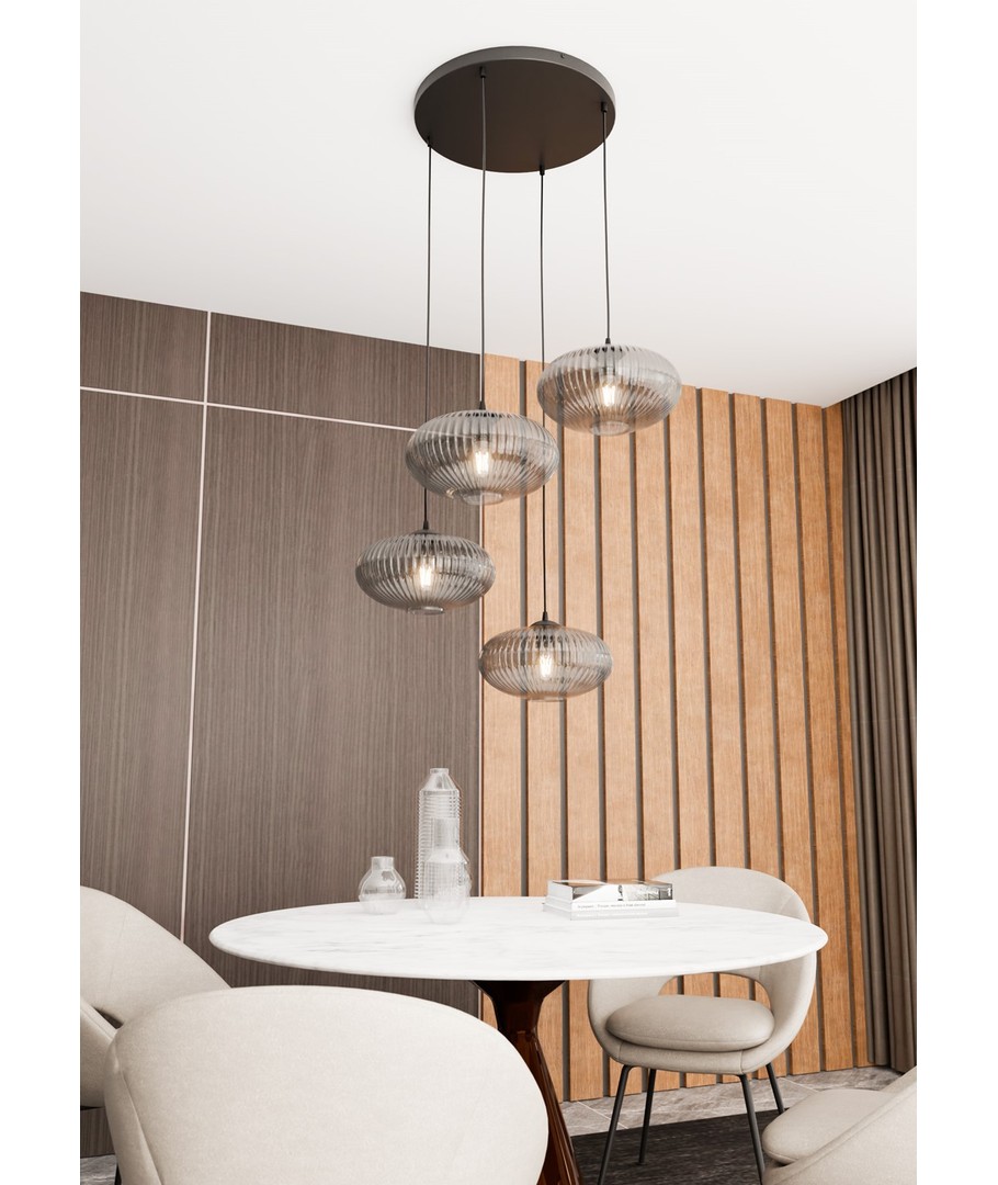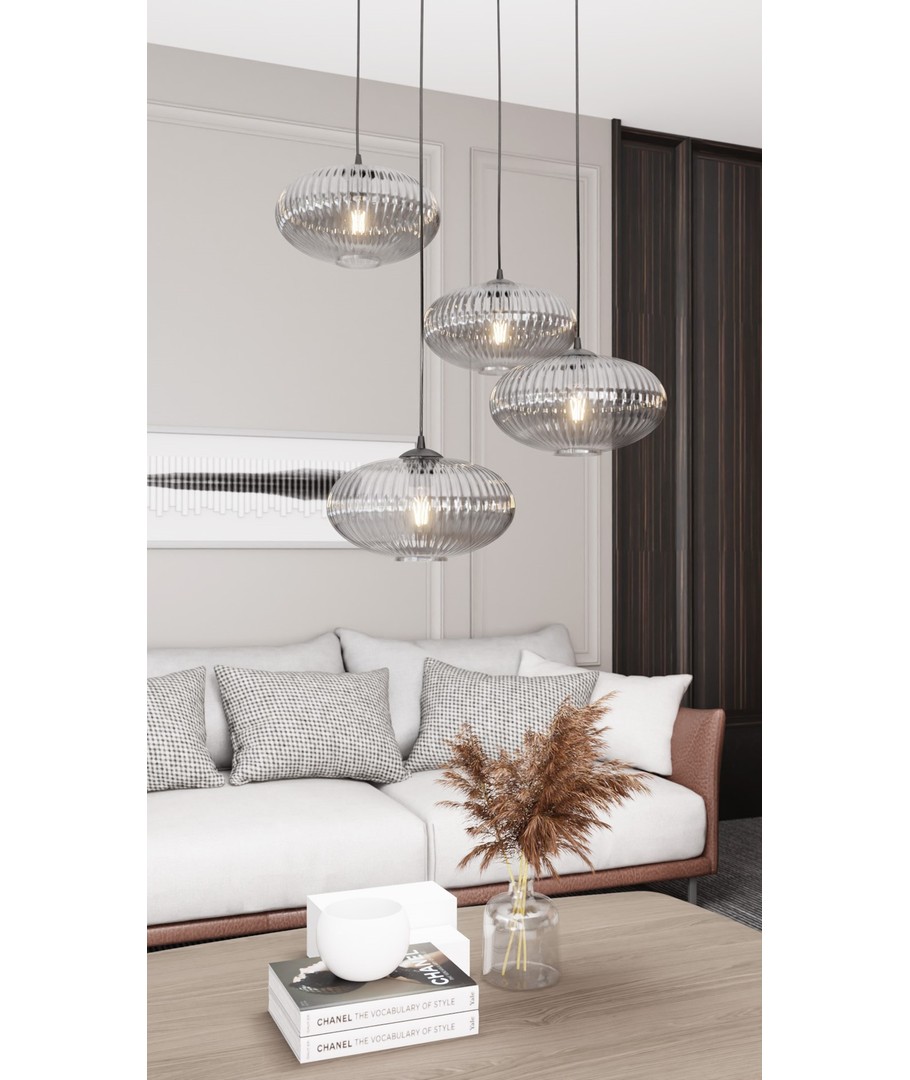 Coco 4 Sort Prem Grafit pendellampe er en moderne belysningsløsning som kombinerer eleganse med funksjonalitet. De stilfulle glasskjermene avgir et varmt lys som skaper en følelse av letthet og subtilitet i ethvert rom. Ideell for stuer og spisestuer fungerer Coco lampen som en stilfull aksent som løfter innredningen. Med sin justerbare høyde tilpasses den enkelt til ulike behov, og den tidløse sorte og grafittfarge passer perfekt inn i moderne hjem.