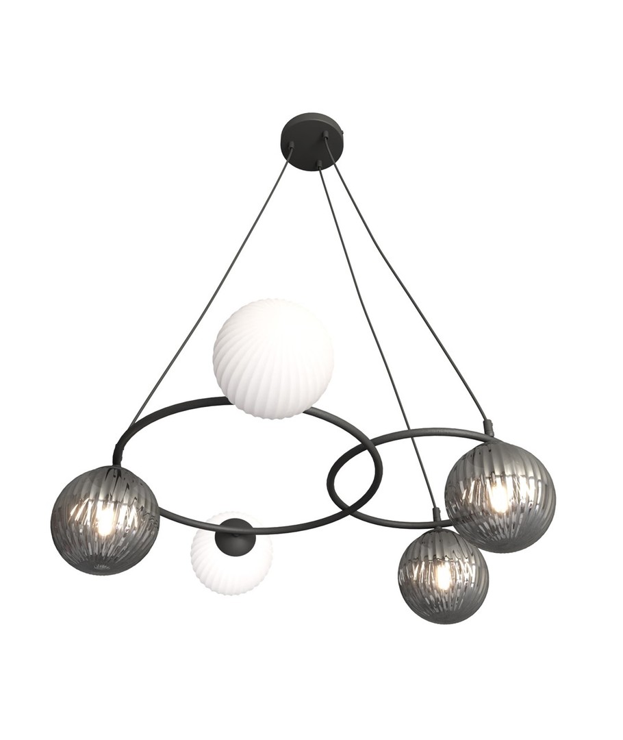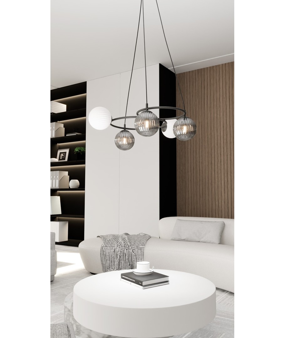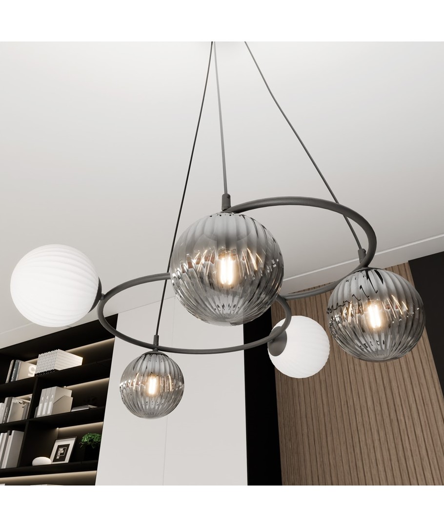 Opplev en unik kombinasjon av moderne design og eleganse med Libra 5 Sort Mix pendellampe. Denne lampen er designet med to stilfulle ringer, som gir et lett og harmonisk uttrykk. De elegante glasslampeskjermene utsender et varmt og behagelig lys, som skaper en koselig atmosfære i ethvert rom. Ideell til stuer, spisestuer og kommersielle miljøer, og tilfører en moderne karakter og eleganse til din innredning. La Libra 5 pendellampe bli det sentrale elementet i dine rom og opplev hvordan den enkelt tilpasser seg forskjellige innredninger.