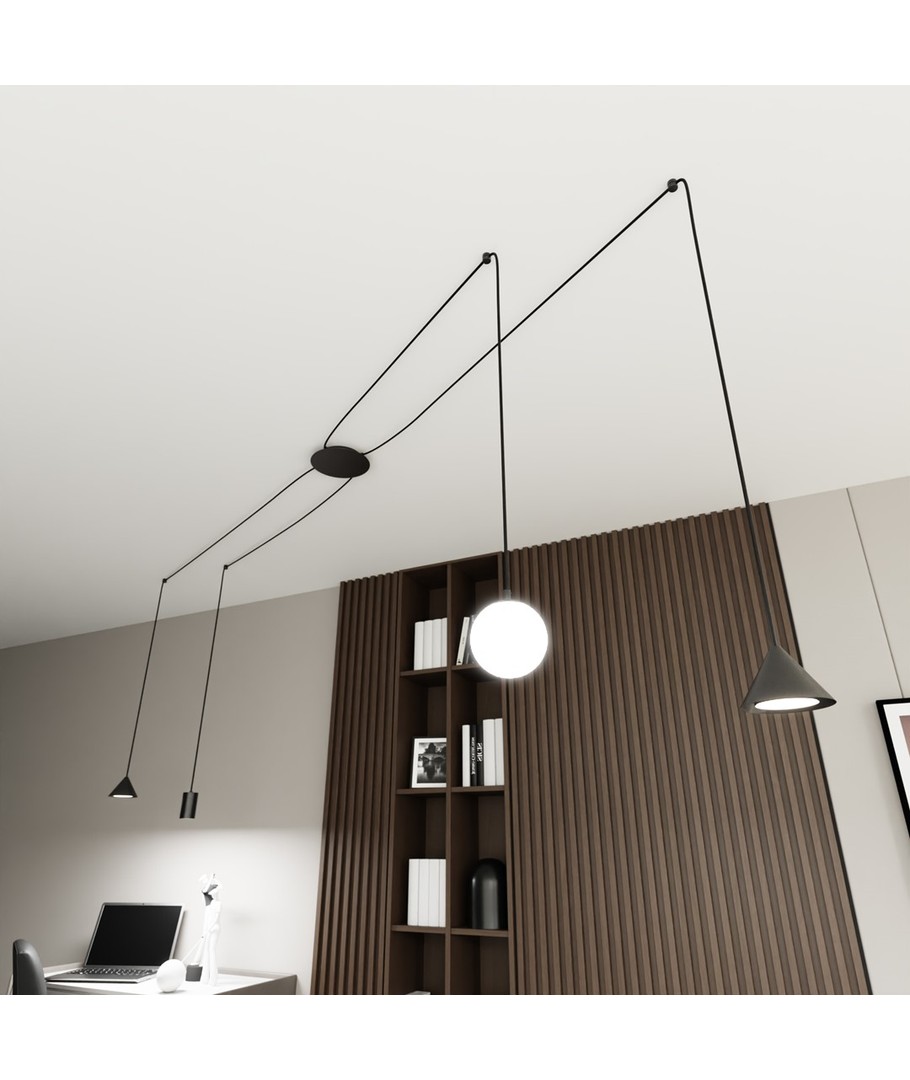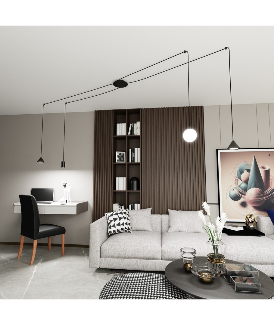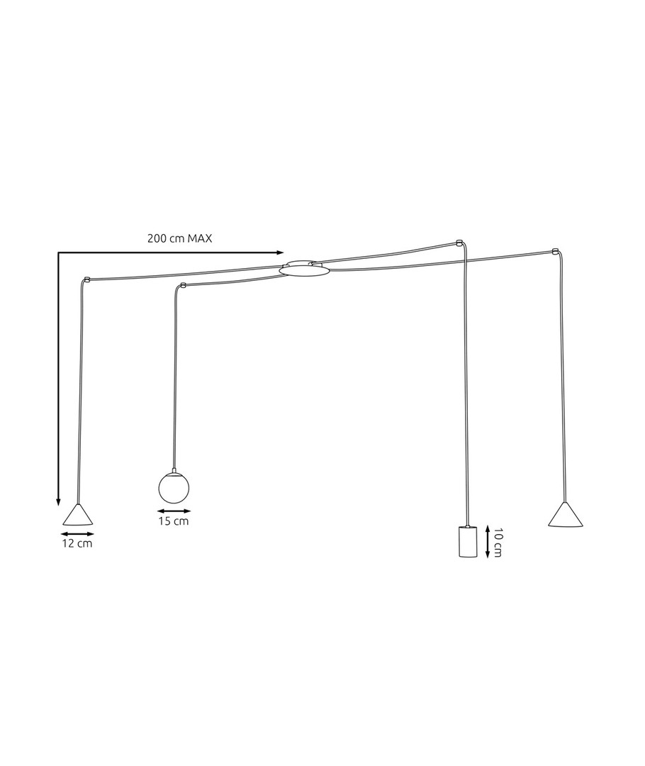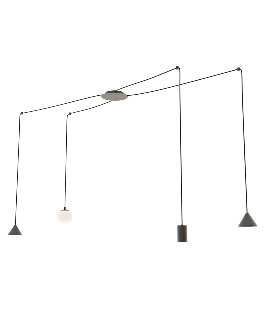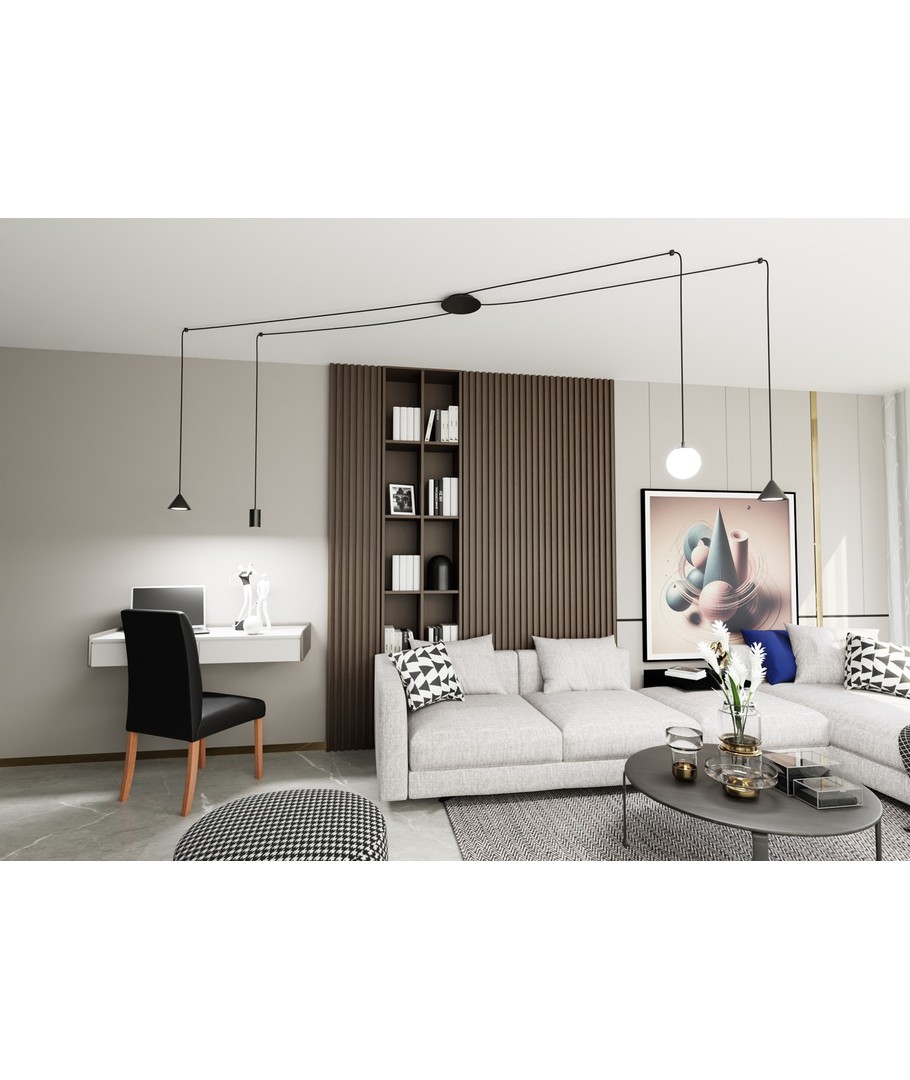 Fuji 4 Sort pendellampe er en del av en imponerende serie av "edderkopp"-type lamper, som skiller seg ut med et moderne og attraktivt design. Med sine mange muligheter for plassering og originalt utforming skaper lampen et unikt visuelt inntrykk i ethvert rom. Kombinasjonen av tre forskjellige lampeskjermer tilfører en særpreget estetikk som fanger øyet. Denne serien er et fremragende valg for alle typer interiører, spesielt høye industrielle rom. Opplev hvordan Fuji-lampen kan forvandle ditt interiør og tilføre karakter og stil.