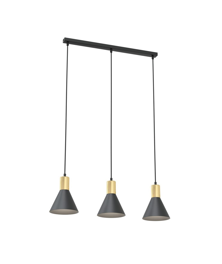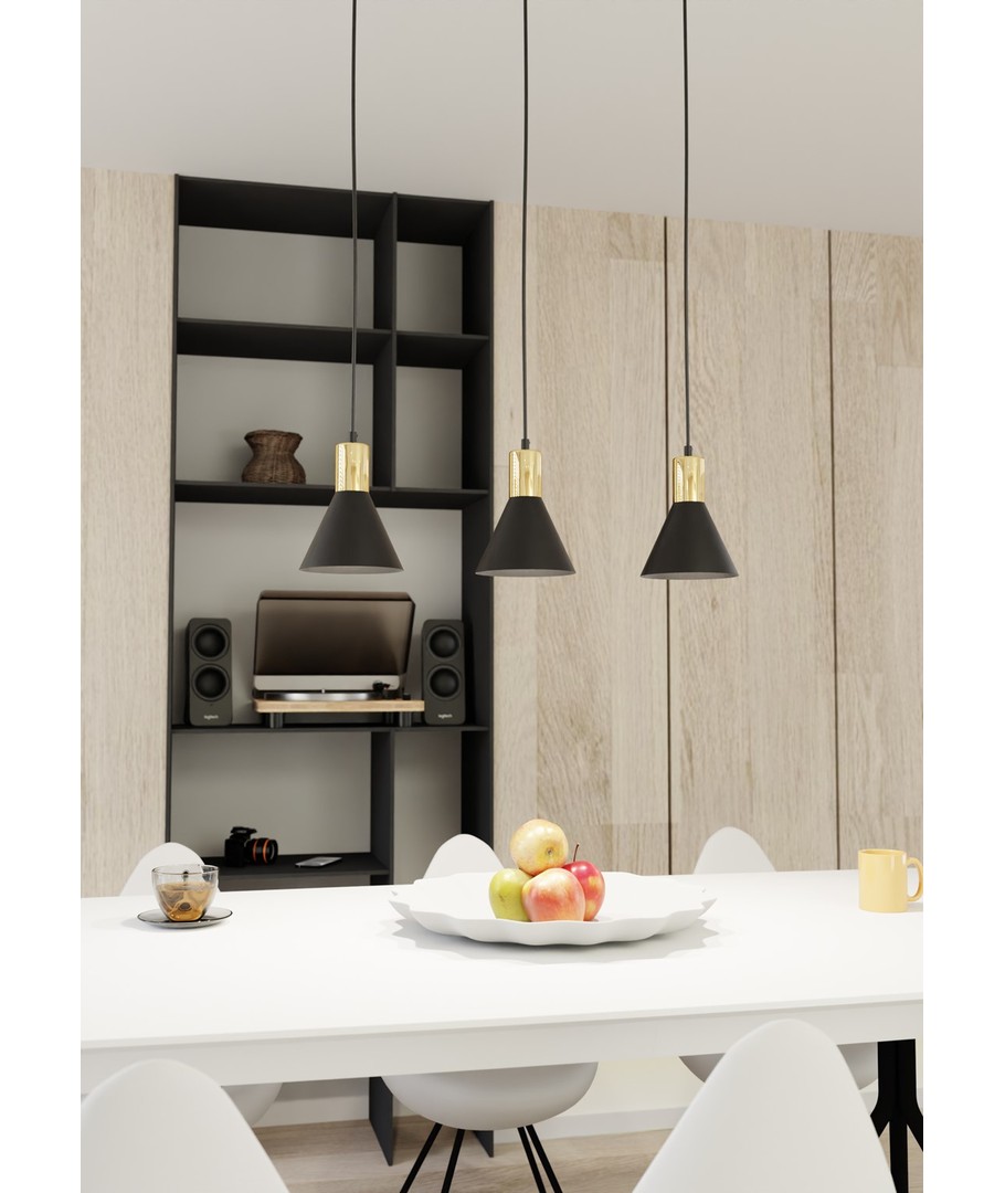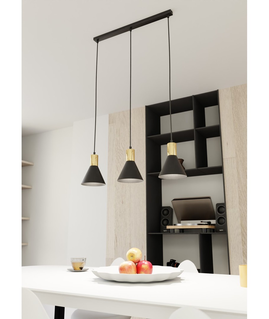Denne lampen kombinerer enkelhet med eksklusive detaljer i sitt design. Den koniske metallkuppelen fremhever lampens industrielle karakter, mens gullkomponentene skaper en varm og raffinert stemning.