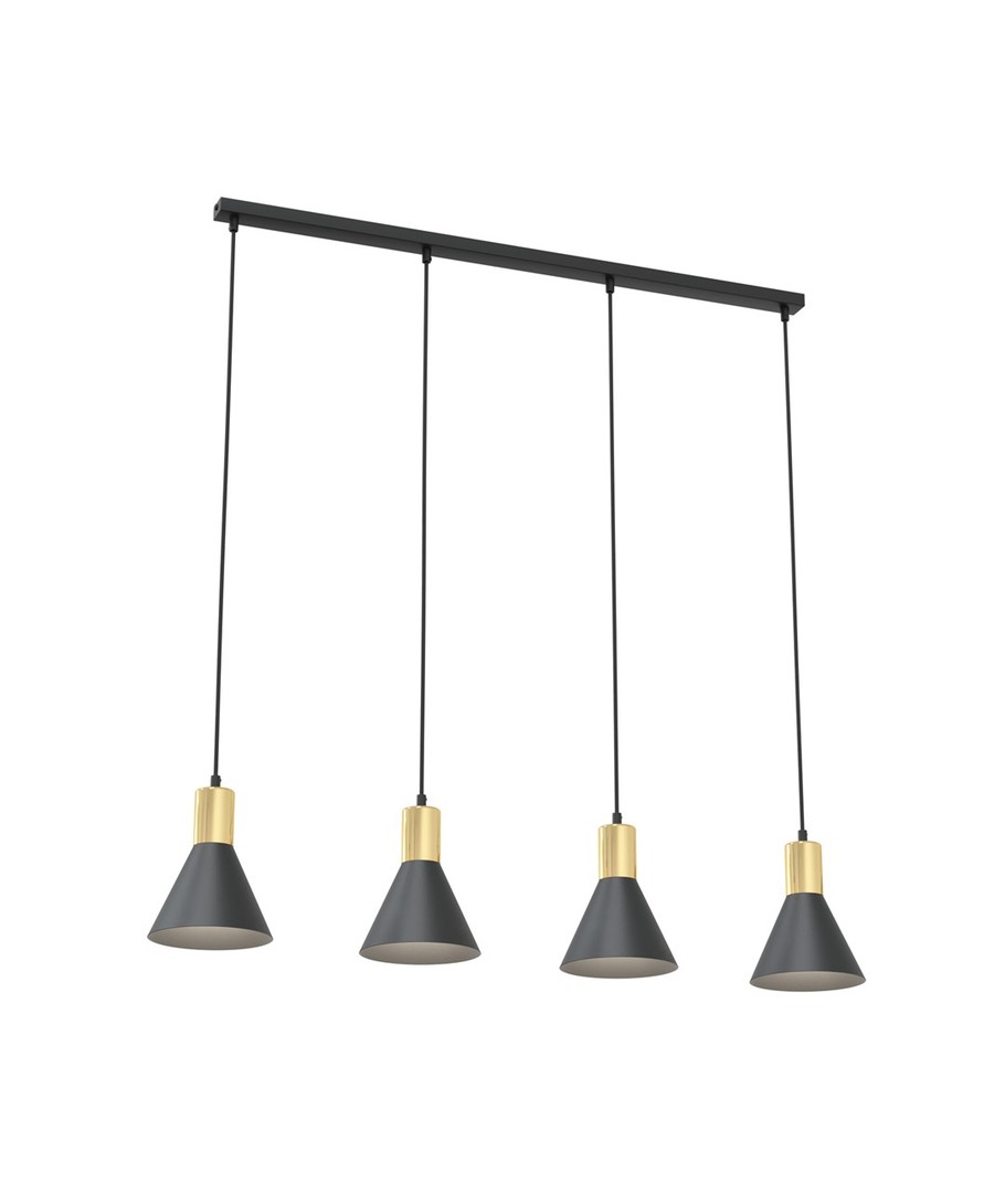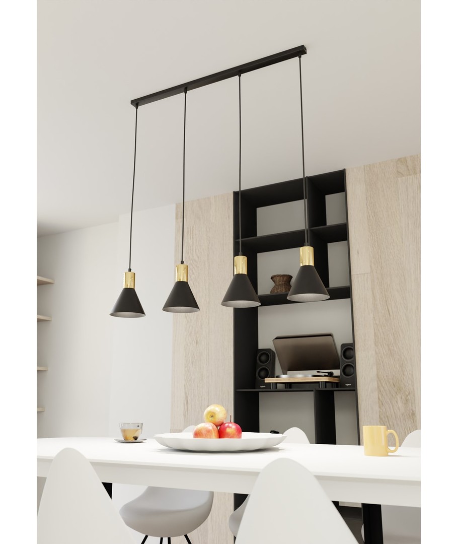 Rosa 4 Sort pendellampe er det perfekte valg for de som ønsker et moderne preg til interiøret uten å gå på kompromiss med funksjonaliteten. Med designet i en elegant svart og gullfarge kombinerer denne lampen en enkel form med raffinerte detaljer som passer perfekt inn i et loft-stil miljø. Den koniske metallskjermen fremhever lampens industrielle uttrykk, mens den gyldne koppen tilfører varme og eleganse. Ideell for stuer, spisestuer eller kjøkken, gir Rosa-lampen en unik atmosfære i ethvert rom.