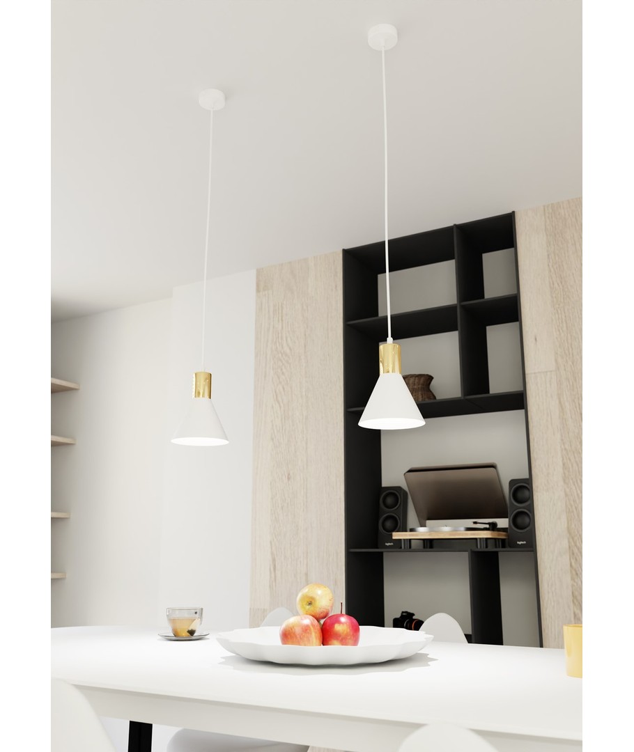 Rosa 1 hvit pendellampe er en stilfull tillegg til enhver loft-inspirert innredning, hvor den forener enkel form med elegante detaljer. Den koniske metalskjermen fremhever lampens industrielle karakter, mens den gyldne koppen tilfører varme og sofistikering. Denne lampen er perfekt for stue, spisestue eller kjøkken og bringer en unik atmosfære til rommet ved å kombinere metallets råhet med den subtile elegansen av en gyllen aksent. Uansett hvor den plasseres, vil Rosa lampen uten tvil tiltrekke oppmerksomhet.