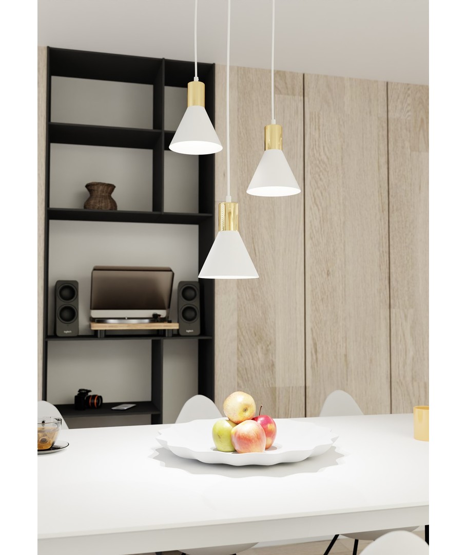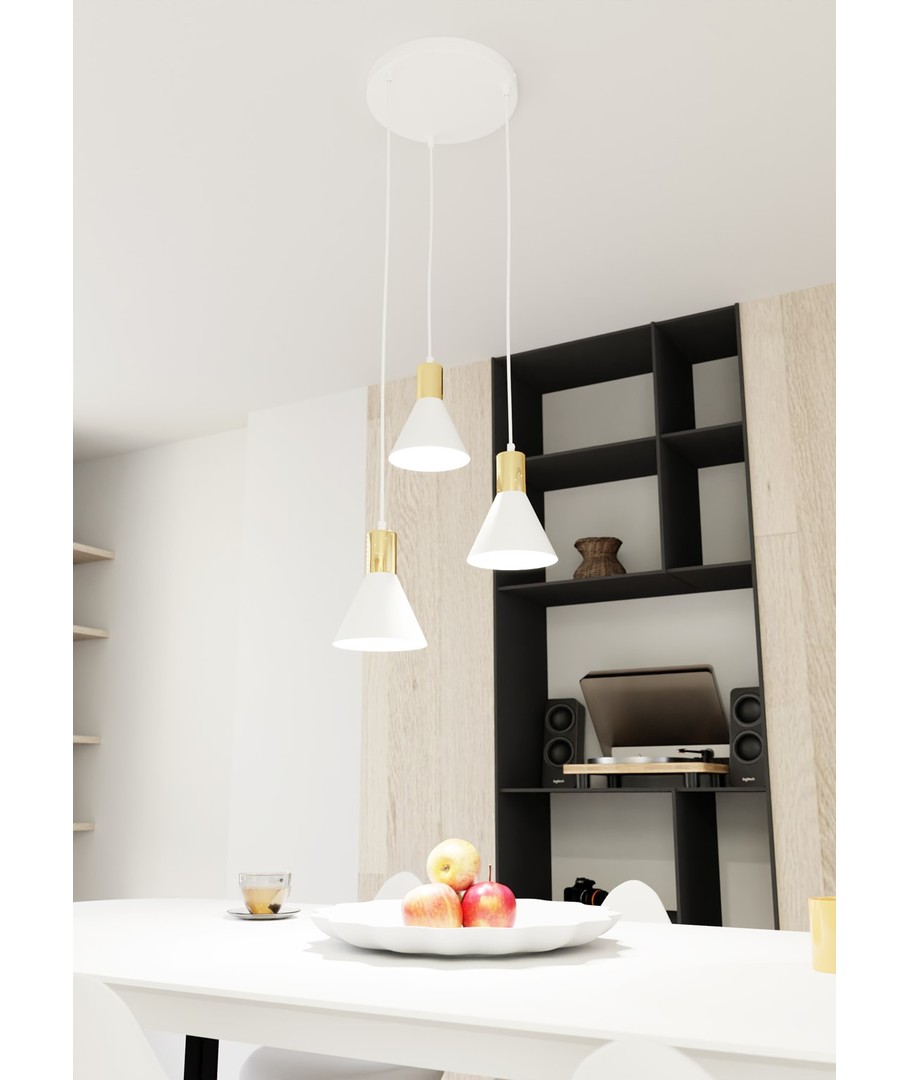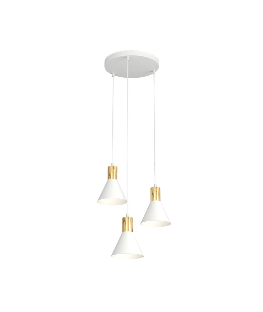 Rosa 3 Hvit Prem pendellampe kombinerer et stilrent design med industrielle noter, noe som gjør den til en perfekt tilføying til ethvert moderne hjem. Lampen er laget med en konisk metallskjerm som fremhever dens rå estetikk, mens den gyldne toppen tilfører et snev av varme og eleganse. Enten den plasseres i stuen, spisestuen eller kjøkkenet, vil Rosa pendellampen gi en unik stemning og sjarm til rommet. Denne belysningsløsningen, som smelter sammen enkelhet og sofistikering, klarer virkelig å lyse opp hverdagen.