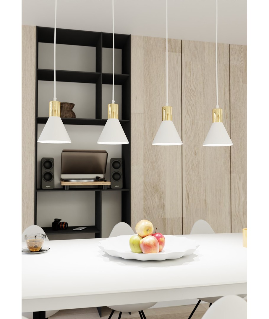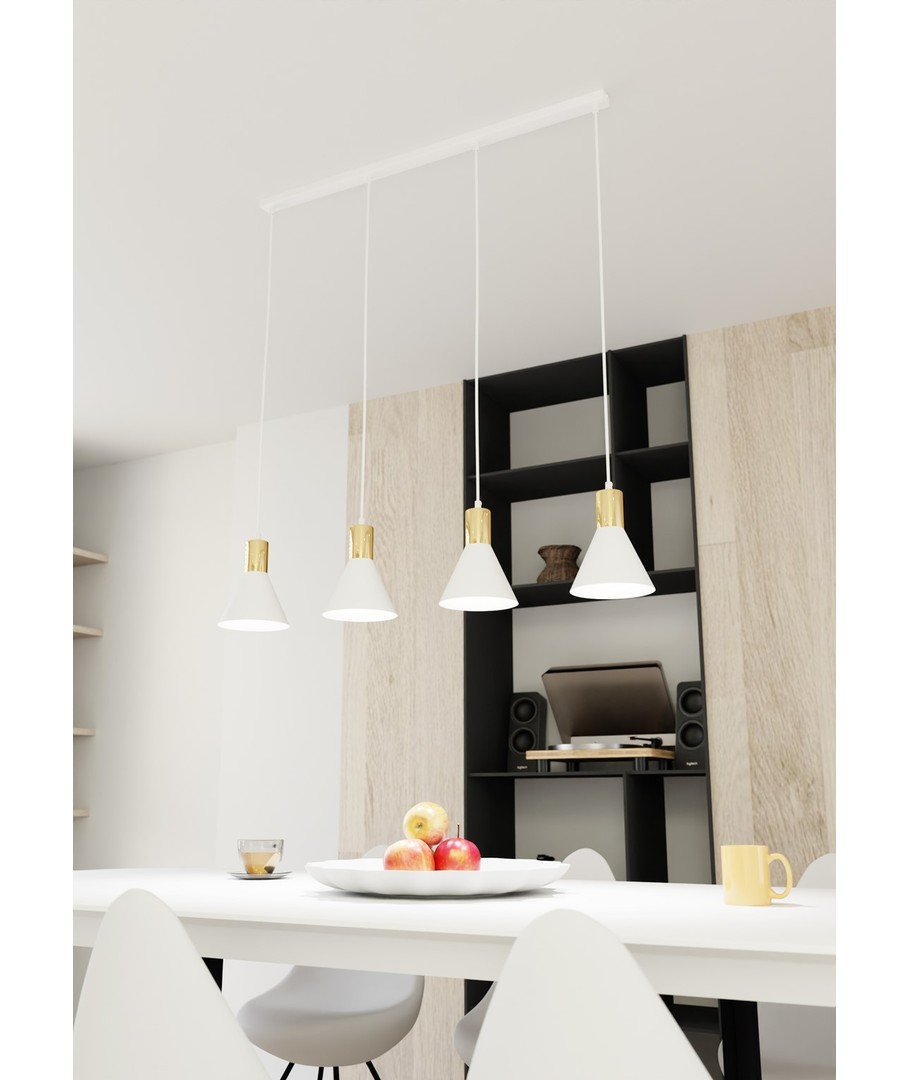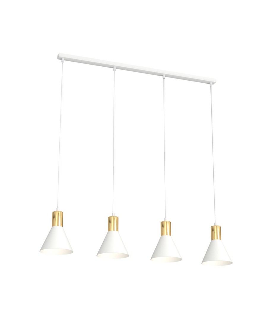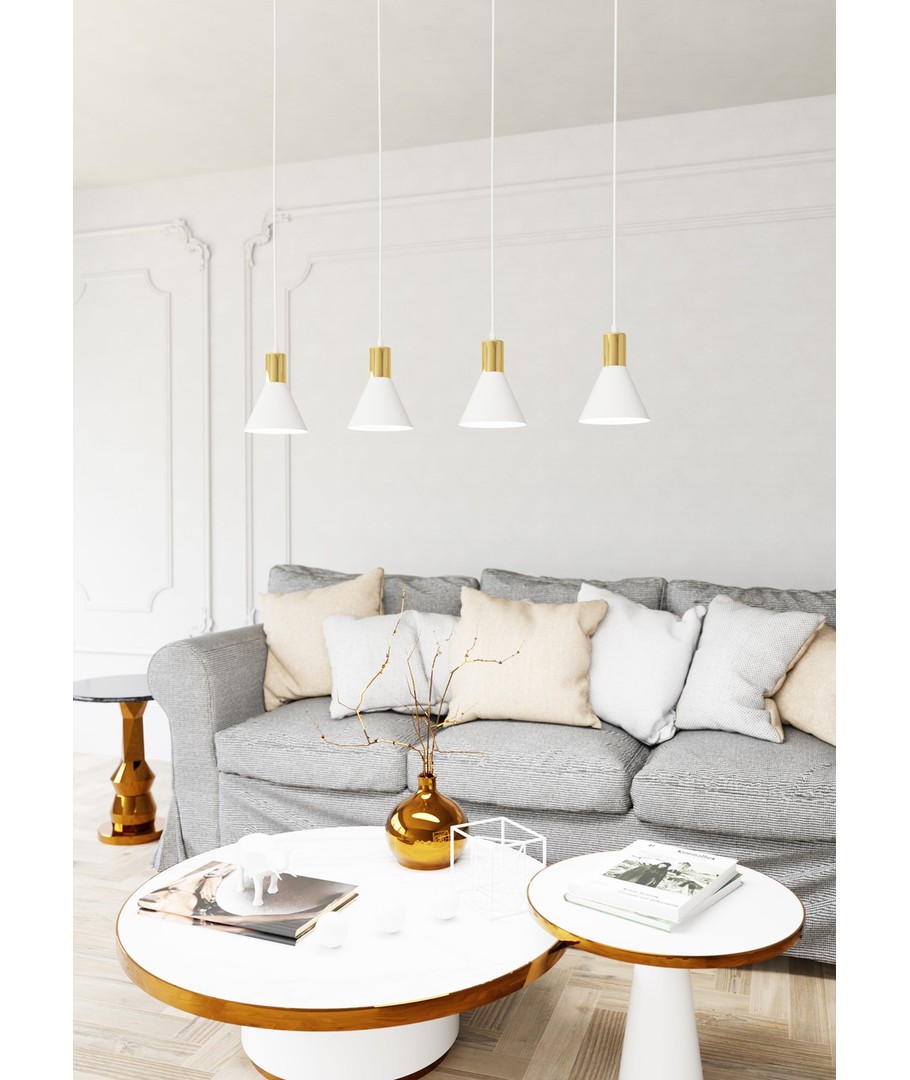 Rosa 4 Hvit pendellampe er den perfekte kombinasjonen av enkelhet og eleganse, ideell for å skape en stilfull atmosfære i ethvert hjem. Med sin koniske, metall lampeskjerm designet i pulverlakkert stål fremhever den lampens industrielle karakter. De gyldne detaljene tilfører en varm og sofistikert følelse, noe som gjør den perfekt til bruk i stuer, spisestuer eller kjøkken. Lampen tilbyr en unik atmosfære som blander metallets ruvhet med en subtil, gylden eleganse, noe som gjør den til et tidløst valg for moderne hjem. Lys opp i rommet ditt og opplev et vakkert samspill mellom funksjonalitet og design.