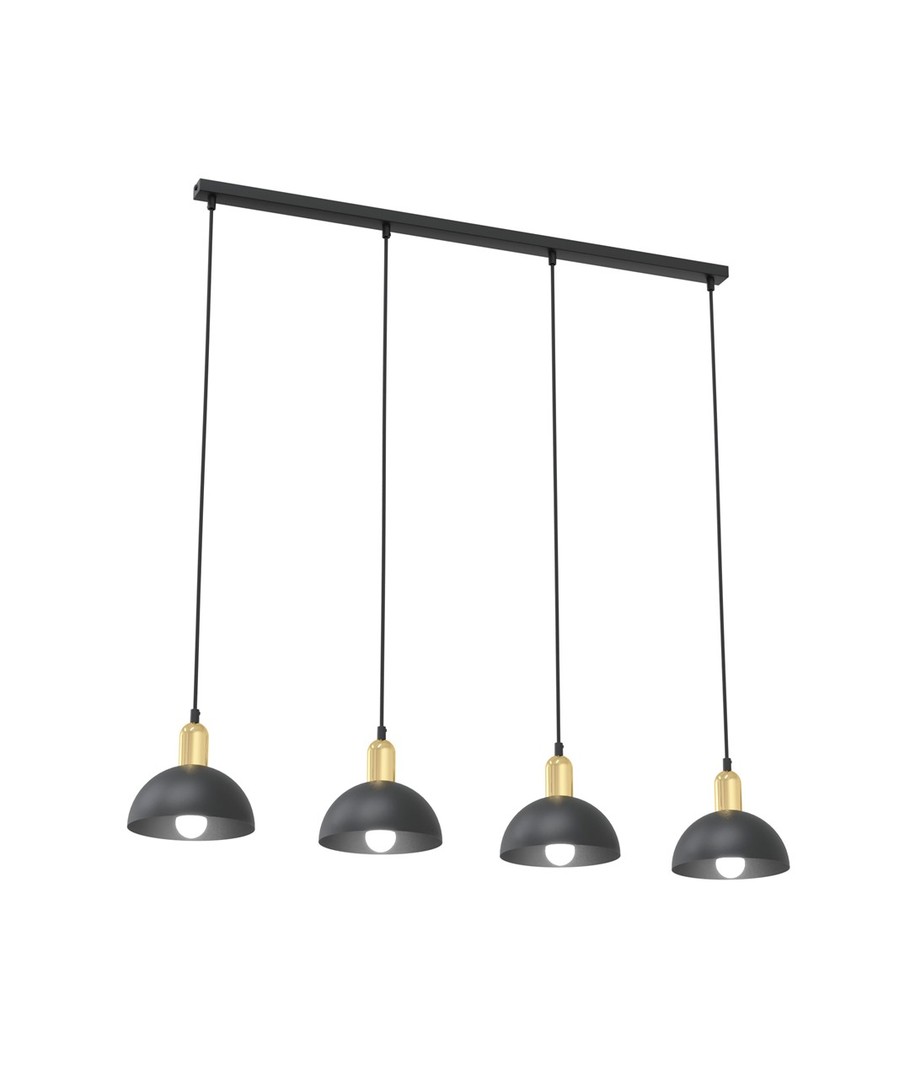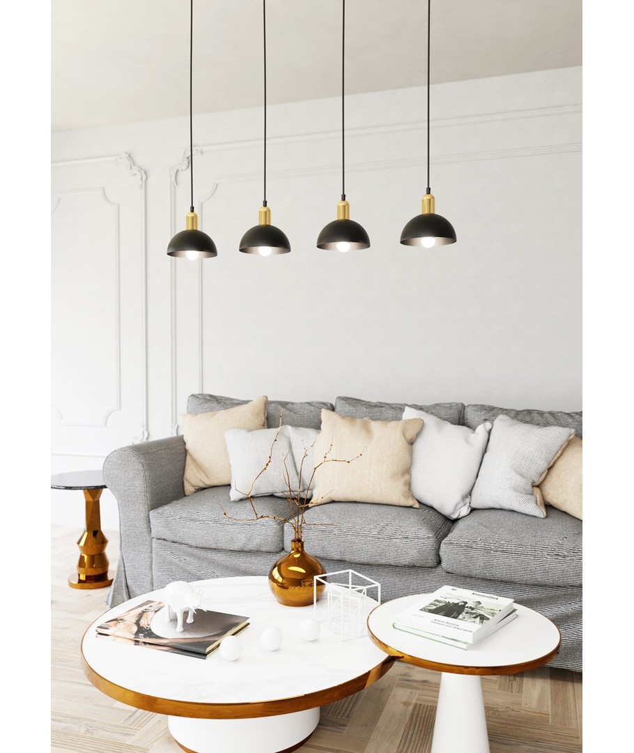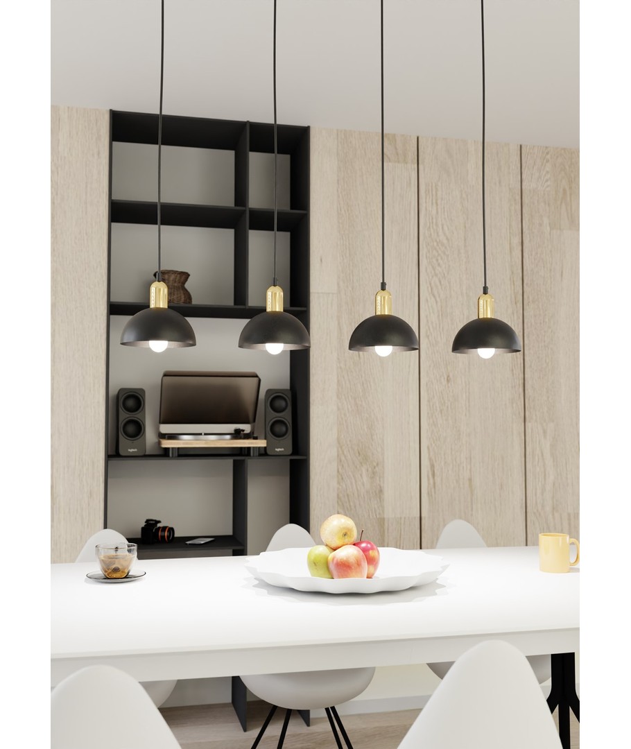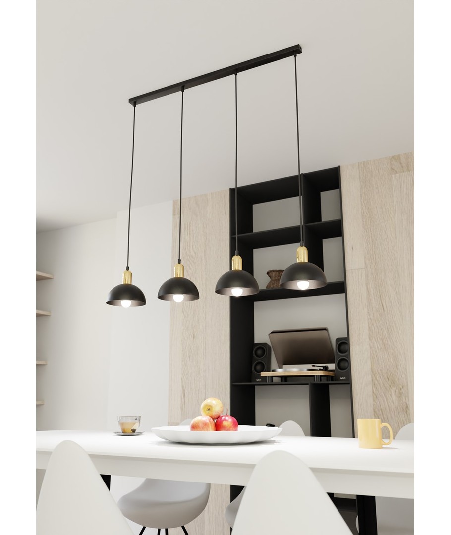 Moto 4 Sort pendellampe er en stilfull belysningsløsning som kombinerer moderne design med industrielle elementer. Denne lampen bringer et unikt uttrykk til rommet med sine sorte metallskjermer og elegante gulldetaljer. Den er perfekt for plassering over spisebordet, i stuen eller som et sentralt element over kjøkkenøya. Designet skaper en behagelig kontrast og tilfører rommet en varm, sofistikert atmosfære. Med Moto-lampen får du ikke bare lys, men en stilfull tillegg til din innredning.
