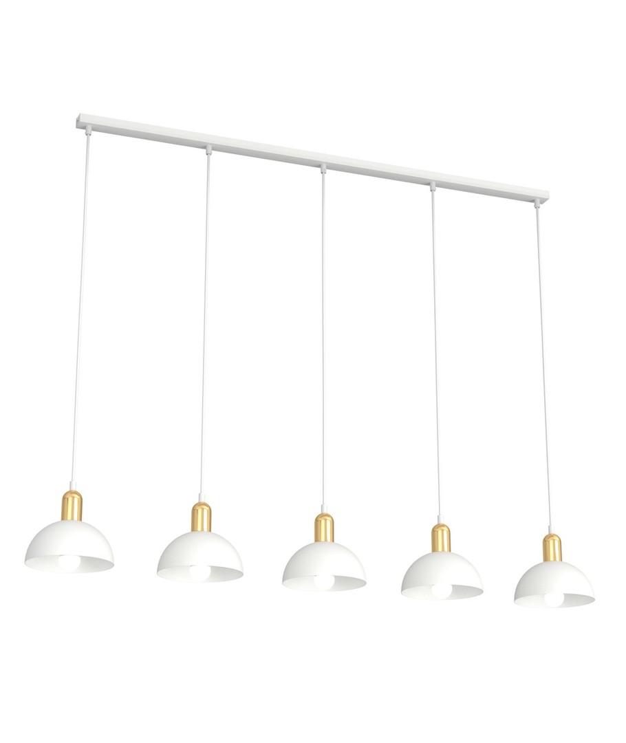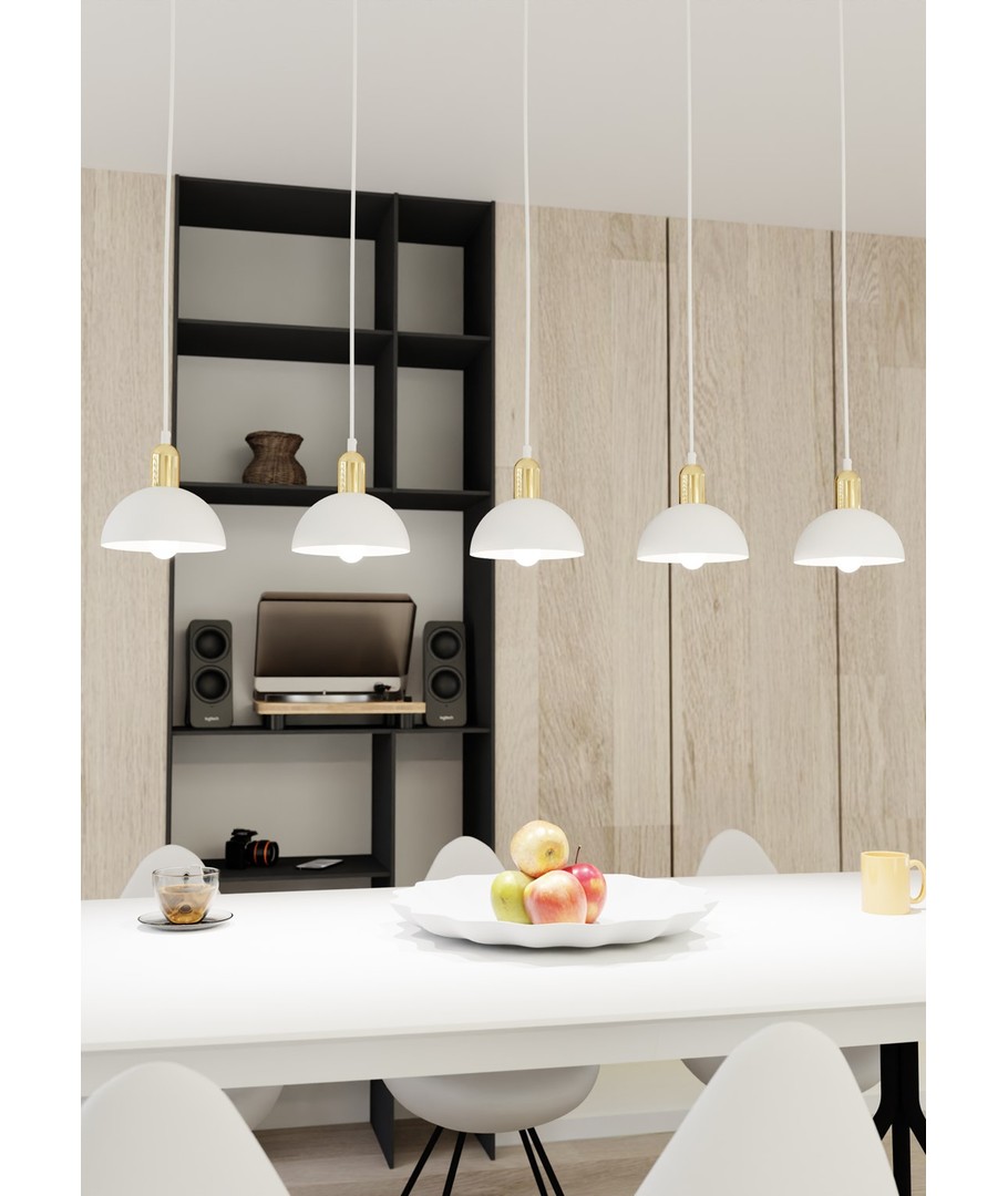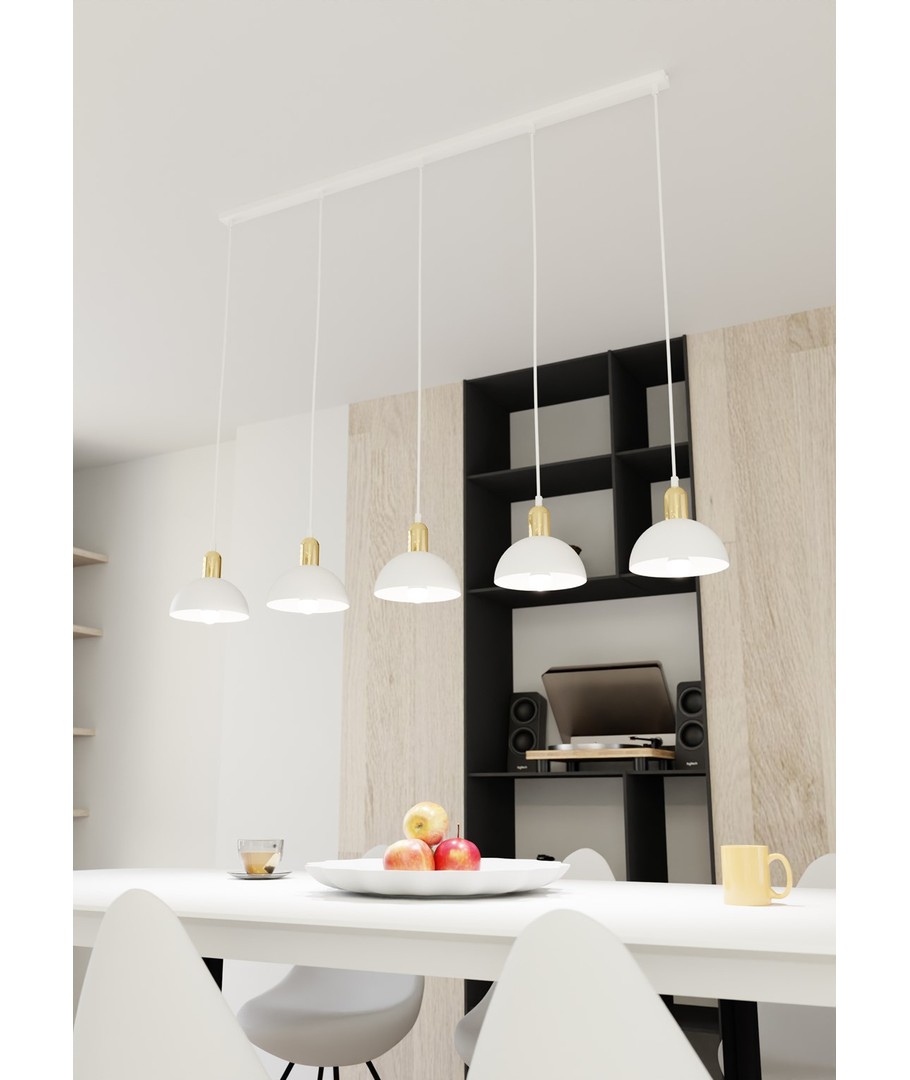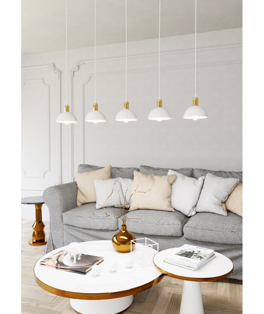 Moto 5 Hvit pendellampe er en imponerende taklampe som bringer industriell stil til hjemmet ditt med et hint av eleganse. Denne lampen kombinerer en rå metallfinish med varme gulldetaljer, noe som skaper en subtil sofistikert atmosfære. Perfekt for både stue, spisestue eller kjøkkenøy, tilfører Moto lampen en unik stemning og en stilfull kontrast til ethvert rom. Den er det ideelle valg for dem som ønsker original belysning med et eksklusivt preg.