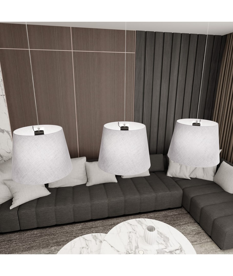 Epoca 3 Grå pendellampe er et utsøkt belysningselement som tilfører eleganse og hygge til ethvert rom. Dens stoffskjermer sprer lyset på en måte som skaper en varm og behagelig atmosfære, ideelt for stuer, spiseområder eller soverom.