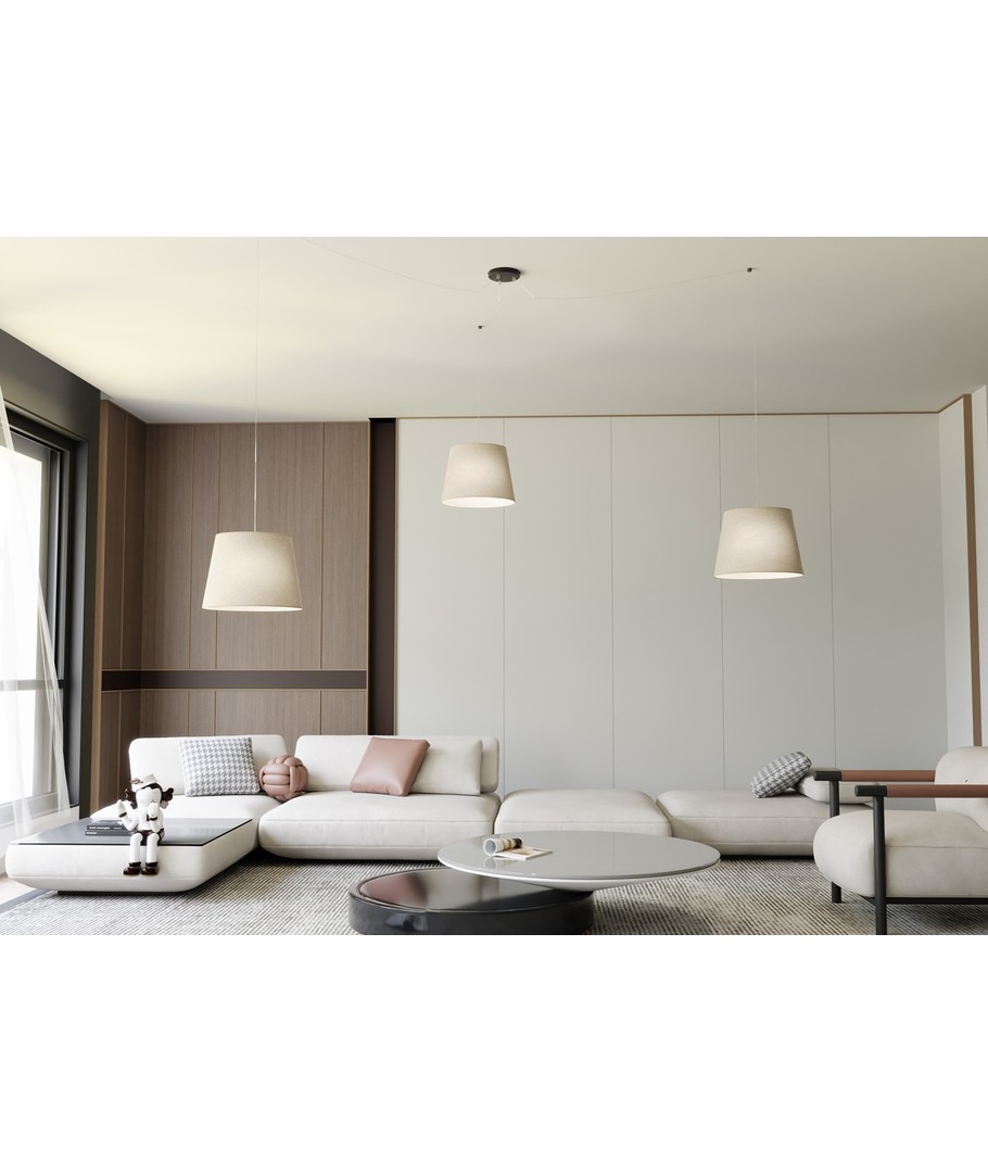 Pendellampen er designet med et imponerende Ø38 cm i diameter, som gir et balansert lysforhold i rommet. Den minimalistiske designen i beige passer sømløst inn i ulike typer interiør, og fungerer spesielt godt i rom med en nøytral fargepalett.